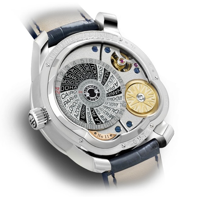 Pozadina kućišta izgleda kao drugi brojčanik, na kojem se nalazi disk sa ispisanim nazivima 24 grada, svaki u različitoj vremenskoj zoni. Pozicioniranjem relevantnog grada u istu liniju sa lokalnim vremenom prikazanim na spoljašnjem prstenu (ili na unutrašnjem ukoliko se radi o gradu koji primenjuje letnje računanje vremena), globus se postavlja u ispravan položaj. Pored toga na zadnjoj strani se nalazi i zlatni disk koji ostavlja veoma jak vizuelni efekat. Obe strane kućišta su zaštićene safirnim staklom sa antirefleksnim premazom.