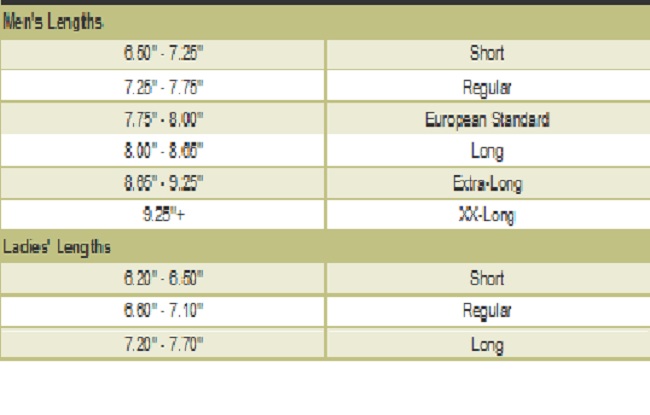U konkretnom slučaju na ilustraciji, obim zgloba je 7.375 inča (7 3/8"), prostim pogledom u donju tabelu zaključujemo da nam je potrebna dužina: Regular.