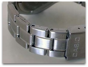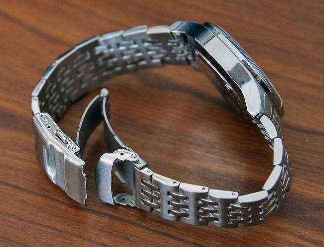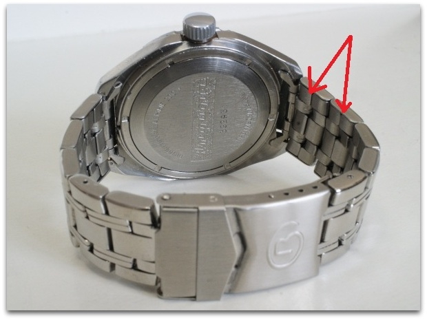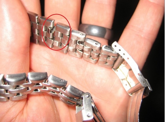 Obratite pažnju na spojeve lima obeležene crvenom strelicom. Iako sa spoljne strane deluje kao narukvica od punog čelika, pažljiv pogled na unutrašnjost otkriva istinu. Ove narukvice, čak i kada su pažljivije izrađene, nisu dugotrajne i uglavnom se sreću na modnim satovima (koji ionako nisu predviđeni za neku dugotrajnu upotrebu) i na starim Vostok Amfibija satovima.