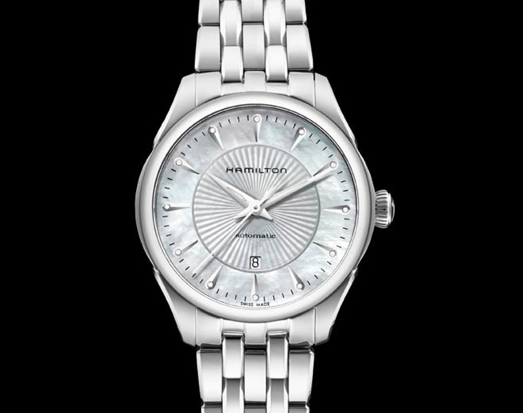 Novi Hamilton Jazzmaster sat je klasičnog izgleda - ima okruglo kućište, sedefast brojčanik i metalnu narukvicu. Kućište je izrađeno od nerđajućeg čelika, promera 30mm, dok je narukvica izrađena od istog materijala kao i samo kućište. Sedefasti brojčanik je dodatno ulepšan i dekorisan sa 12 sitnih dijamanata postavljanih na satnim markerima. Centralni deo cifera ima izgled sunčevih zraka koji se od centralnog dela šire ka koroni. Pored standardnog prikaza vremena (sati, minuti, sekunde), ovaj časovnik ima funkciju prikaza datuma, smeštenu na poziciji “6h”. Brojčanik je zaštićen safirnim staklom. Automatski mehanizam pokreće ovaj model i on se kroz providan poklopac može videti sa zadnje strane sata. Deklarisana vodootpornost sata je do 50m.