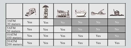 - WR 50 (50 meters / 5 ATM) ova oznaka pokazuje da sa ovim satom smete na kišu, možete prati kola i istuširati se. Nije preporučljivo potapanje i duže ostajanje u vodi.