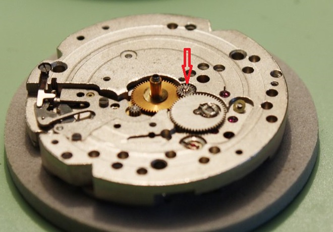 Moj urar mi kaže da treba naći i promijeniti ovaj zupčanik koji pokreće mehanizam datuma (na slici zaokruženo crvenim).