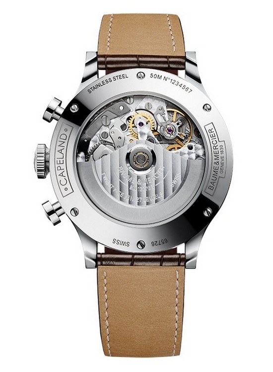 Baume & Mercier satove Capeland serije pokreće dobro poznati i dokazani hronografski mehanizam Valjoux 7753, koji omogućava merenje sata, minuta i sekundi, a takođe poseduje komplikaciju datuma, kao i hronograf. Podbrojčanici na poziciji 3 i 6 sati služe za merenje do 30 minuta i 12 sati, dok se na poziciji 9 sati nalazi podbrojčanik za sekunde. Otvor za prikaz datuma smešten je na poziciji 4:30.