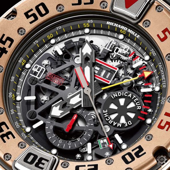 The RM 032 also possesses a running indicator, located at 3 o’clock. Thanks to both its geometry and 2-rpm rotational frequency, it is possible to check the correct functioning of the running movement under stressful conditions. The running indicator disc is composed of successive Superluminova and black sectors; as a result it can be easily read during day or night.