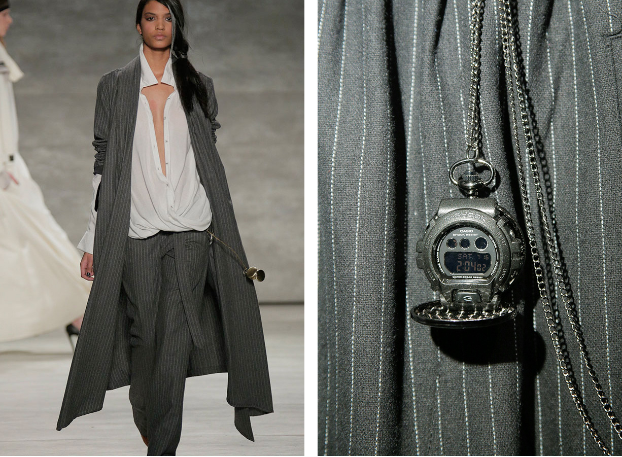 G-Shock je specifičan po svojim performanasama i dizajnu, ali on ove godine čini korak napred. Casiov čuveni “G” se prošetao na modnoj pisti u obliku džepnog sata. Časovnik koji uglavnom asocira na sportske i ekstremne aktivnosti se našao u rukama madih manekenki u New York-u.