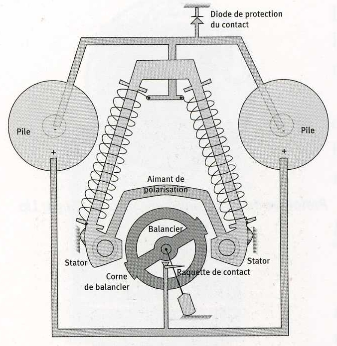 Pojednostavljeno objašnjeno viljuška oscilira tako što električni signal transformisan od strane tranzistora aktivira elektomagnetni kalem što dalje dovodi do vibriranja oscilirajuće viljuške ( The electric signal transformed by the transistor activates an electromagnetic coil that puts a metal tuning fork into vibration ). Postavlja se pitanje kako se osciliranje viljuške ( čije osciliranje reguliše elektronika ) prenosi na zupčanike i dalje na kazaljke? Jedna od genijalnosti mehanizma leži u načinu kako je to regulisano a regulisano je pomoću tri elementa, jednog zupčanika ( index wheel ) i dve žičice ili šipkice. Jedna žica zove se „index finger“ a druga „pawl finger“ ( nisam siguran kako se ovi tehnički termini prevode na srpski i da li je uopšte moguć prevod). Obe žice imaju na krajevima rubine. „Index finger“ je žičica ili šipkica koja se nalazi na vibrirajućoj viljušci i ona prenosi energiju tj pokreće ili još bolje rečeno gura „index wheel“ . Druga žica ( „pawl finger“ ) ne nalazi se na vibrirajućoj viljušci nego na mostu ( pawl bridge) i ima ulogu kočnice tj ona sprečava da se „index wheel“ okreće unazad. Praktično jedna šipkica je pogonska a druga ima kočionu funkciju. „Index wheel“ koji ima 300 zubaca visine 1/100 mm, dalje prenosi energiju preko sklopa zupčanika ( tzv gear train koji čine prvi, drugi, treći i četvrti zupčanik ) sve do kazaljki. Inače taj sklop koji čine pogonska i kočiona žičica sa rubinima i zupčanik ( index wheel ) je toliko sitan da se golim okom teško vidi tako da su sve fotografije koje pokazuju pomenuti sklop uvećane nekoliko desetina puta . Čak i na tim uvećanim fotografijama praktično se ne vide zupci na tzv index wheel-u.