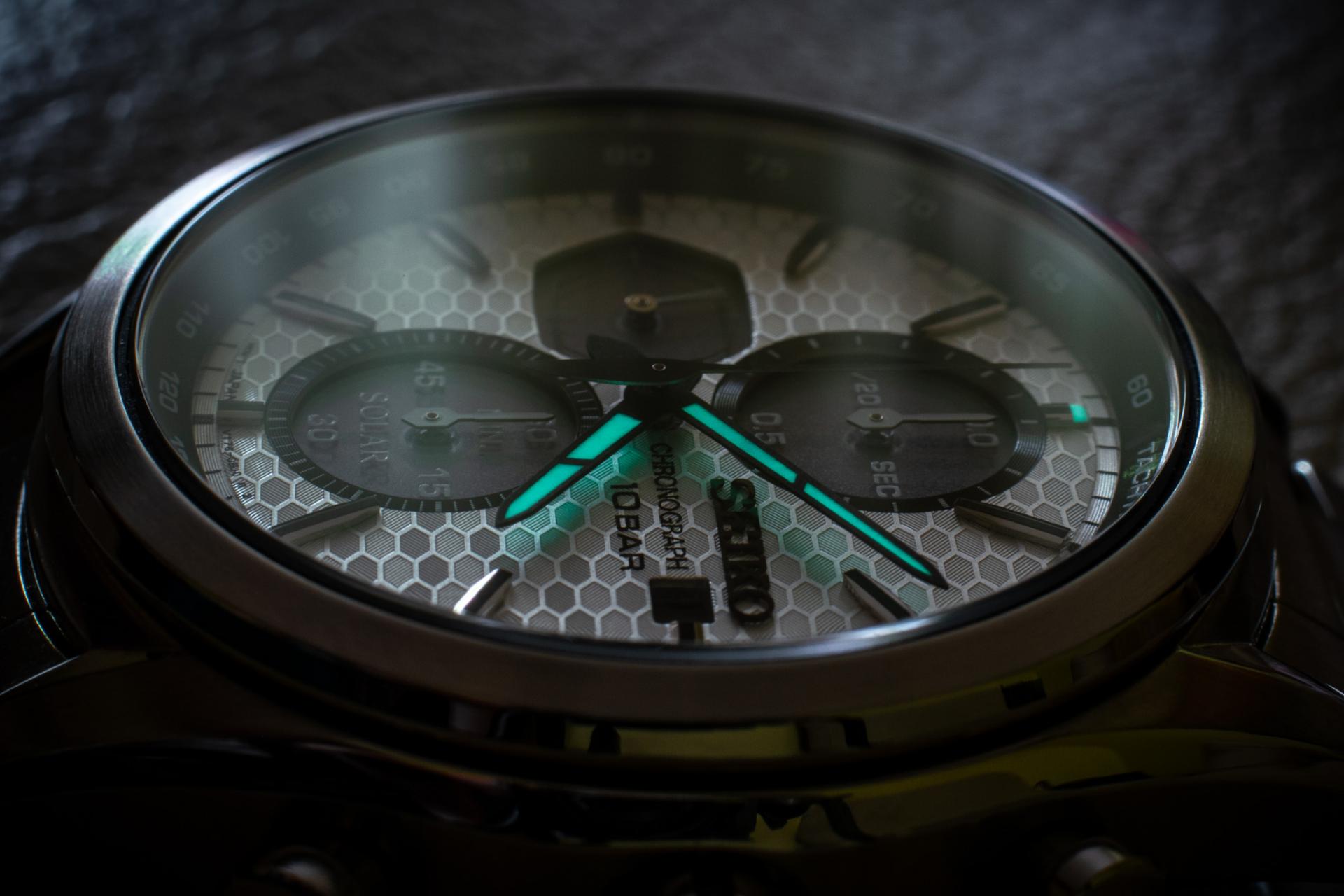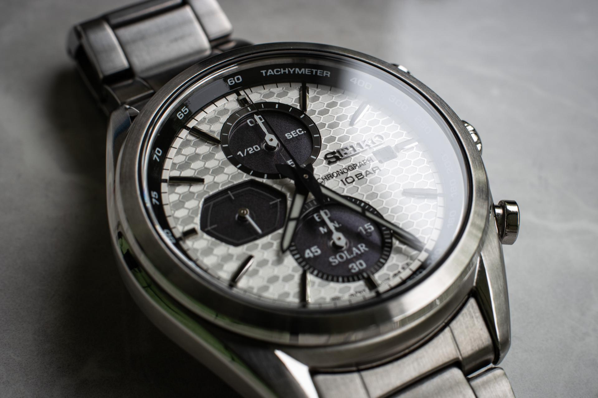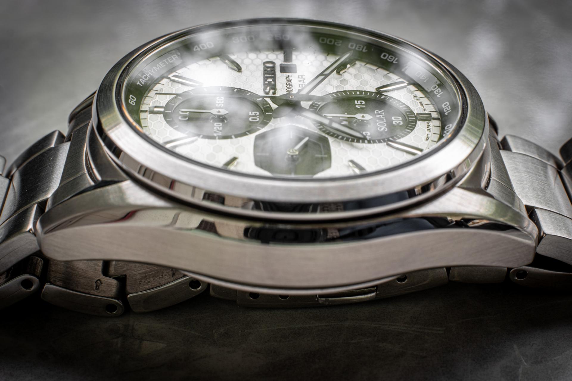 Inace, ne znam koji su ti trenutno kriterijumi ali Seiko SSC769P1 me odusevio, kad se uzme u obzir cenovni rang. Solarni kvarcni mehanizam, jako zanimljiv brojcanik sa hex teksturom izgleda moderno, a opet daje omaz starijim seiko hronografima. Puno dubine ima na brojcaniku posto su indeksi aplicirani metalni, podbrojcanici su upusteni i plus imaju neki sloj providan preko solarnih celija, pa tekst baca senku na solarne panele, dodajuci na dubini. Tahimetar skala je pod uglom i stoji iznad svega ostalog na brojcaniku. Vrlo lepo kuciste sa kombinacijom poliranih i brusenih povrsina, 100m vodootpornost. 41mm, ne previse debelo, lepo stoji manje-vise svima. Surak ga kupio na moju preporuku i super je zadovoljan. Njemu stoji odlicno na ogromnoj ruci, i meni na relativno malom zglobu. Uklapa se u manje-vise sve odevne kombinacije i prilike. Safirno staklo, izgleda i sa AR premazom, posto mu je citljivost dobra, osim kad crne kazaljke predju preko ovih crnih delova pa se ne vide najbolje. Narukvica nije nista spektakularno ali zavrsava posao. Kontam da bi dobro izgledao i na koznim i nato kaisevima.