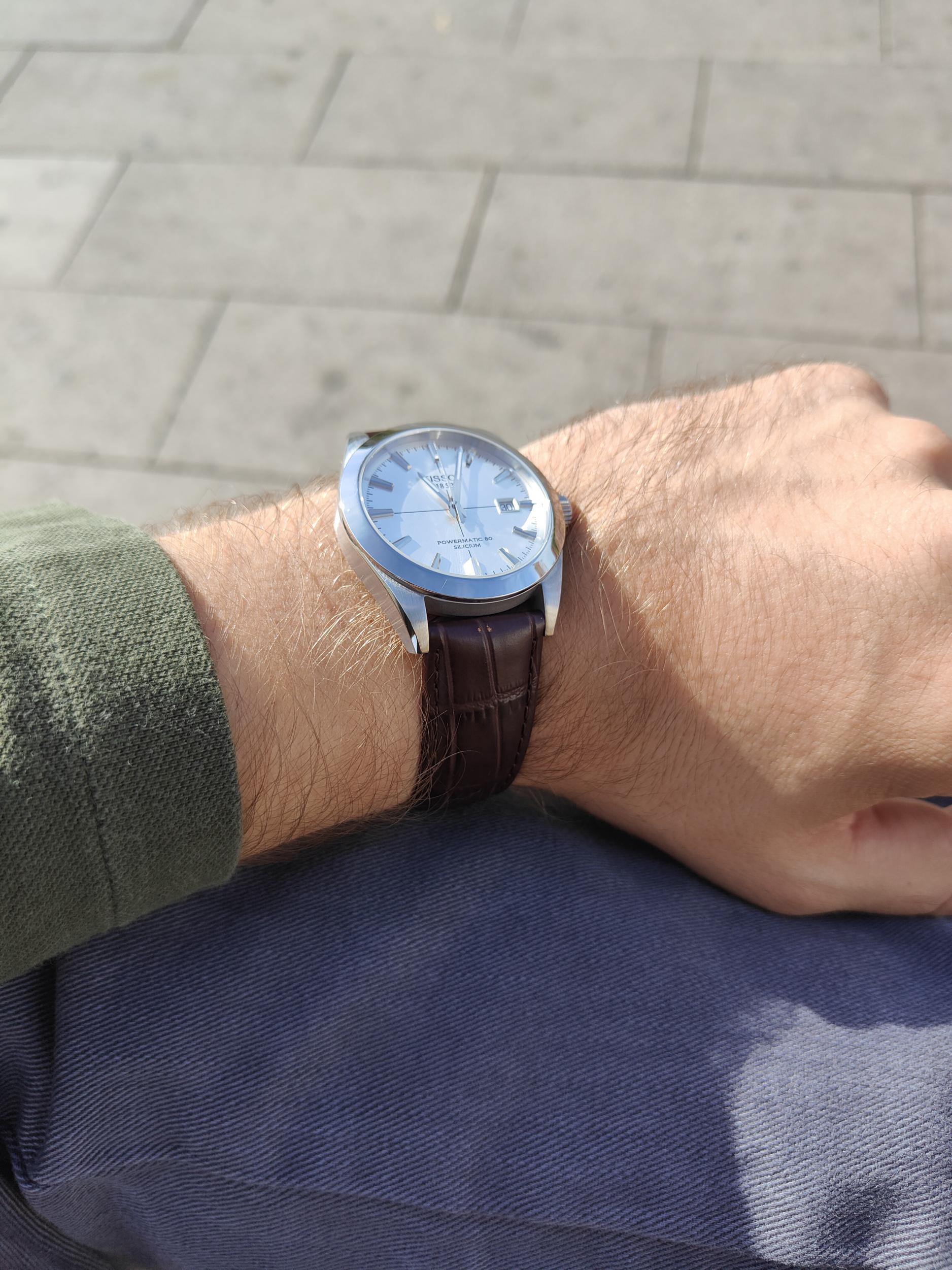Bio sam zaista oduševljen satom, bojom cifera, kvalitetom kućišta, činjenicom da ima silicijumsku oprugu te da je u pitanju skoro najviši razred Powermatic 80 mehanizma( neka me neko ispravi ako grešim). Dodao bih još i safirno staklo sa obe strane, vodootpornost 100 metara, a sam sat u isto vreme ima i dress konotaciju, a može da se nosi i u raznim drugim prilikama. Svestan sam da sam uzeo sat na kožnoj narukvici, u radnji nije bilo Tissota sa belim ciferom na metalnoj narukvici, ali sam video da se može nabaviti originalna za oko 150e, a to je taman ta razlika u ceni. Inaće, izbor je inzenađujuć za mene iz razloga što već imam kvarcni Visodate, pa sam isključio Tissot iz prvobitnog izbora u potpunosti, želeći da se upoznam i sa nekim drugim proizvođačem. U ove dve nedelje sam primetio da mehanizam za sada radi odlično, odstupanja nisu mimo propisanih, a nadam se da će tako i ostati.