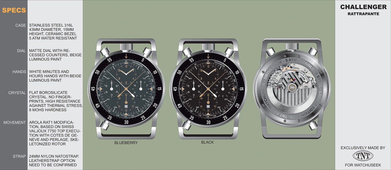 The watch has a 316L stainless steel case with a diameter of 43mm. It houses a Swiss made Valjoux 7750 with AROLA Alfred Rochat & Fils RAT1 module. This movement is a “top execution” with côtes de Genève and perlage. The movement will have a skeletonized rotor.