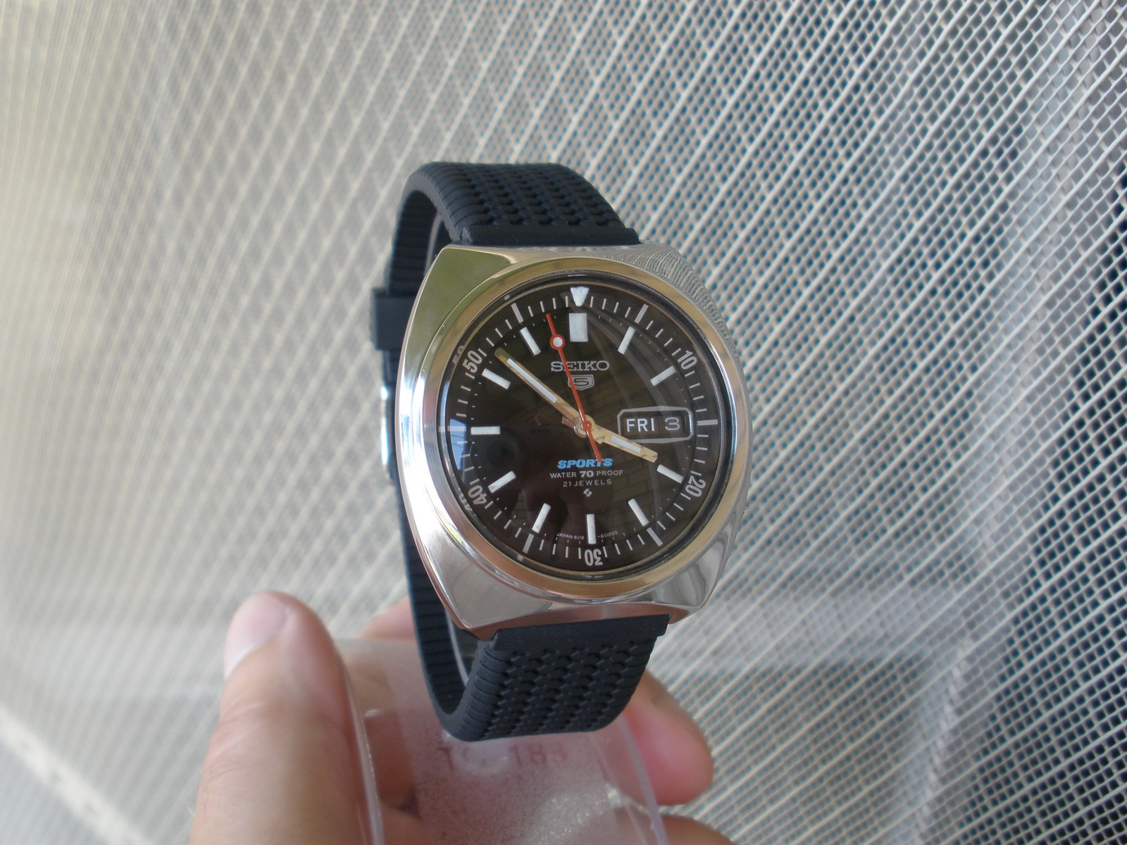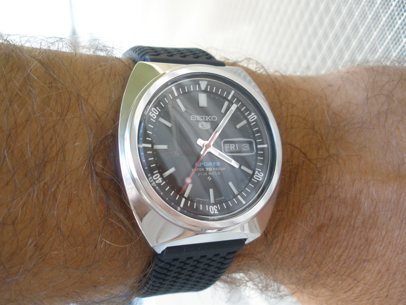 Ovih dana nosim na ruci Seiko 6119-6023 Sports sedamdesetku staru 42 godine. Sat je veoma tačan i udoban za nošenje a slike ponovo postavljam zato što sam ga poslednjih par dana ponovo polirao jer nisam bio zadovoljan nekim detaljima. Cifer jako dobro svetli u mraku ali ne uspevam da napravim kvalitetne fotografije.