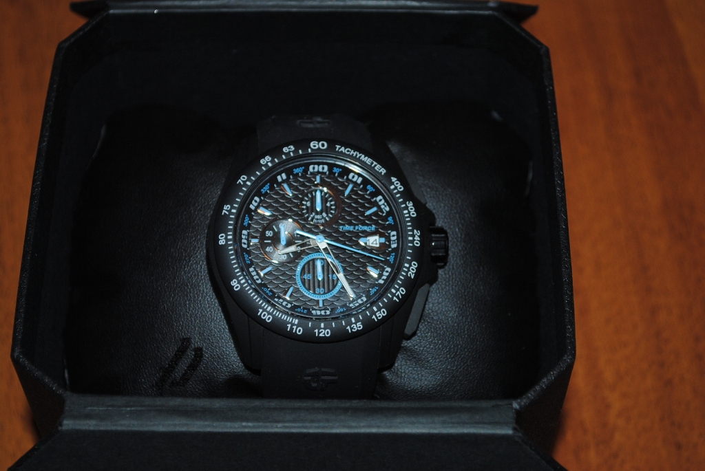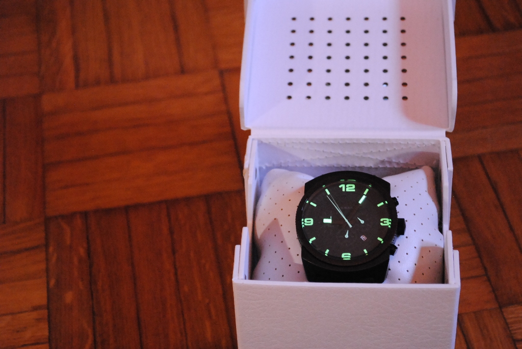 Sat je kupljen pre tačno 1. God. u jednoj prodavnici u Bulevaru i bila je to ljubav na prvi pogled. Prvo što mi je ostavilo utisak kod prezentacije prodavca,je masivna i kvalitetno urađena kutija (vodootporna),u kojoj se nalazio ovaj model sata,sa rezervnim kaišom od kvalitetne i debele kože,sa ukusno urađenim štepom u žutoj boji,koja dominira na ciferu (fabrički dolazi sa montiranim silikonskim kaišem).Pored dva crna kaiša u kompletu je i alat za samostalnu zamenu kaiša,detaljno uputstvo za upotrebu sa karakteristikama mehanizma i sertifikat iz fabrike o izvršenoj proveri na vodootpornost 30atm.