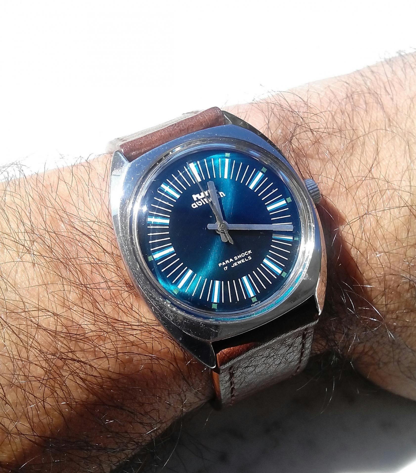 U međuvremenu uletjela su dva egzotična iz daleke nam I prijateljske Indije. Oba HMT-a, jer je HMT sinonim za indijsku horologiju. Plavog Avinasha sam ubo slučajno, u jeku HMT projekta na WUS-u u kojem sam sudjelovao, ali I nakon nekog vremena odustao, jer je cijeli project ispao bogojavljenje. Dizajnom I bojom mi se svidio upravo ovaj model koji je bio jedan od takmičara za konačni dizajn, no na moje razočaranje nije pobijedio. Međutim, kod ustupanja mjesta u projektu javio mi se jedan Indijac koji je uzeo moj sat i ponudio mi da mi ovakvoga pronadje u Indiji (postaju sve rjeđi). I samo godinu dana kasnije, kad mi vise nije ni trebao, a i sve ssam zaboraviol javio mi da ga je našao. Budući da mi je sad bilo neugodno odbiti ga, a cifra nije bila neka (17$), rekoh 'what the Krisna' i uzeh ga, iako me je poštarina na kraju ispala skoro kao sat i bilo je peripetija sa slanjem, jer navodno Indian Post ne šalje u Hrvatsku, Tu je uskočio kolega veberz i primio ga u Mađarskoj i poslao ga. Je li bilo vrijedno peripetijas? Paaaa… govorimo o satu od 20$...ne može čovjek očekivati ne znam šta… Sam sat je po Zoltanu bio momački 'uljepšavan' za prodaju, bio mu potreban servis, a i objektivno, sa svojih 34mm bez krunice, čak i meni skroman na ruci…Mislim OK i savršen za mali zglob, ali opet… Da su ga bar 2mm povećali, a kamoli na 40mm kao što je moglo biti u projektu, bila bi to satina i sigurno me ne bi napustio. Plava boja je izuzetna, naručito pod različitim svjetlima, layout cifera meni odličan čak i za unisex sat. No budući da sam znao da neće biti keeper, odmah sam si rekao da ga neću ni piokušavati prodavati, jer je, objektivno, bila skuplja pita od tepsije, pa sam si zamislio pokloniti čovjeku koji mi je i pomogao da ga dobijem- veberzu, koji će ga znati bolje iskoristiti za neke druge projekte (što jedva čekam). Anyway, znam da ima dobar dom.