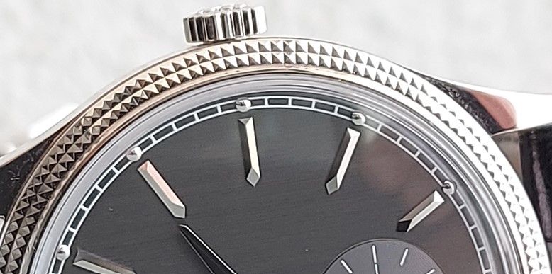 3 ATM vodootporno kućište se zaključuje vrhunsko potpisanom krunicom, koja je izuzetno manipulativna u vidu vrlo glatkog procesa navijanja. Primereno satu dress orijentacije, safirno staklo je ravno a premazano je unutrašnjim antirefleksivnim premazom. Meni najlogičnije objašnjenje zašto nije upotrebljen i vanjski premaz leži u činjenici, da proizvođač naginje efektu sjaja, koji bi u tom slučaju bio malo ugušen. Ne primećujem da je zbog toga čitanje brojčanika otežano.