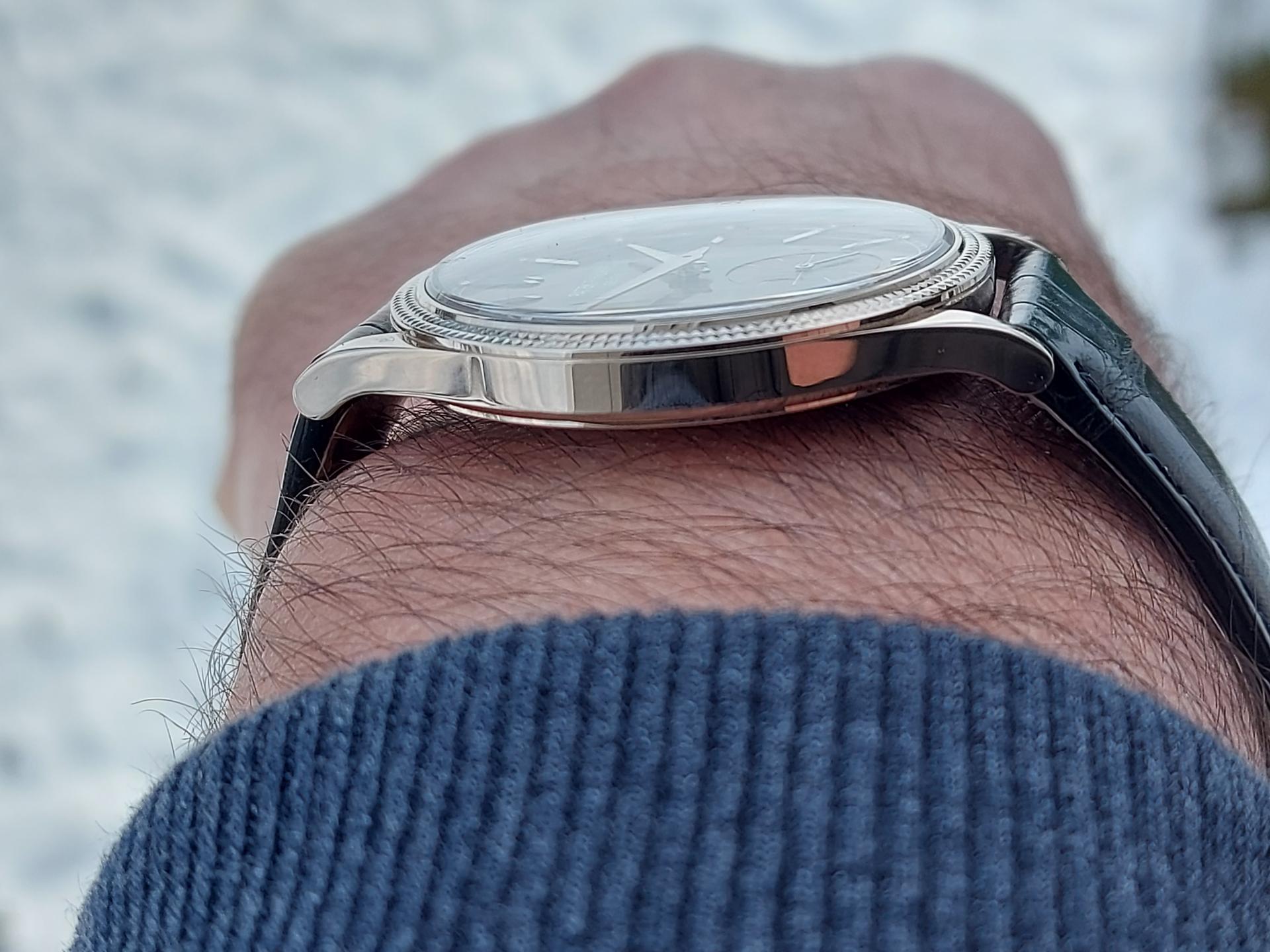 Zahvaljujući navedenim proporcijama, kao i širokim zaobljenim lugovima, sat odlično leži na ruci. Ako tome dodamo da uprkos belom zlatu, njegova težina iznosi samo 62g, onda je ugođaj zaista jedinstven.