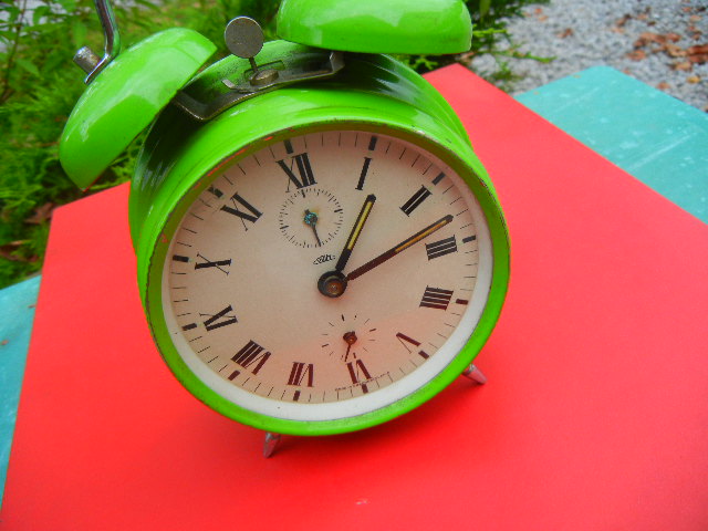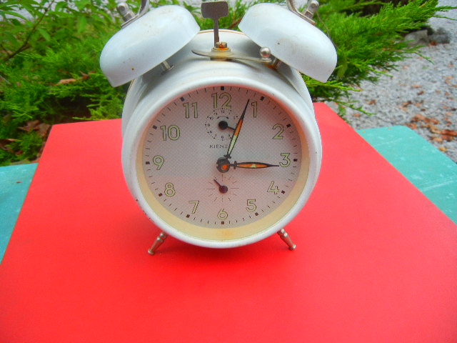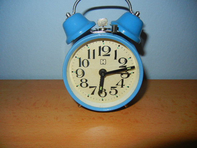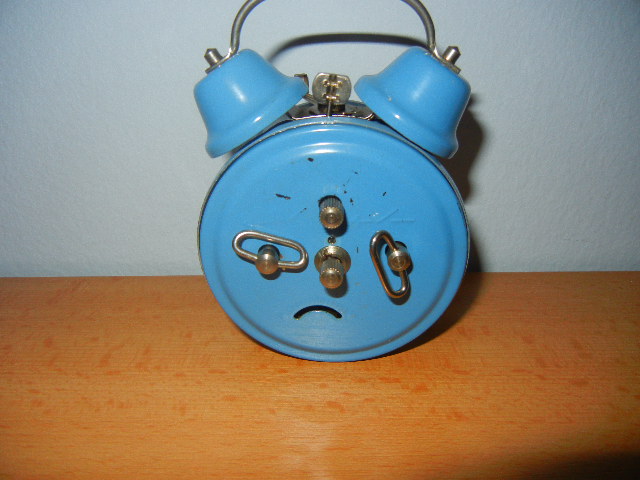 mala plava budilica sa vanjskim zvonima