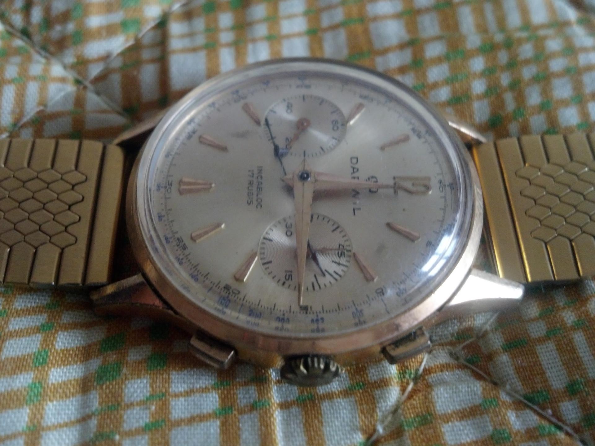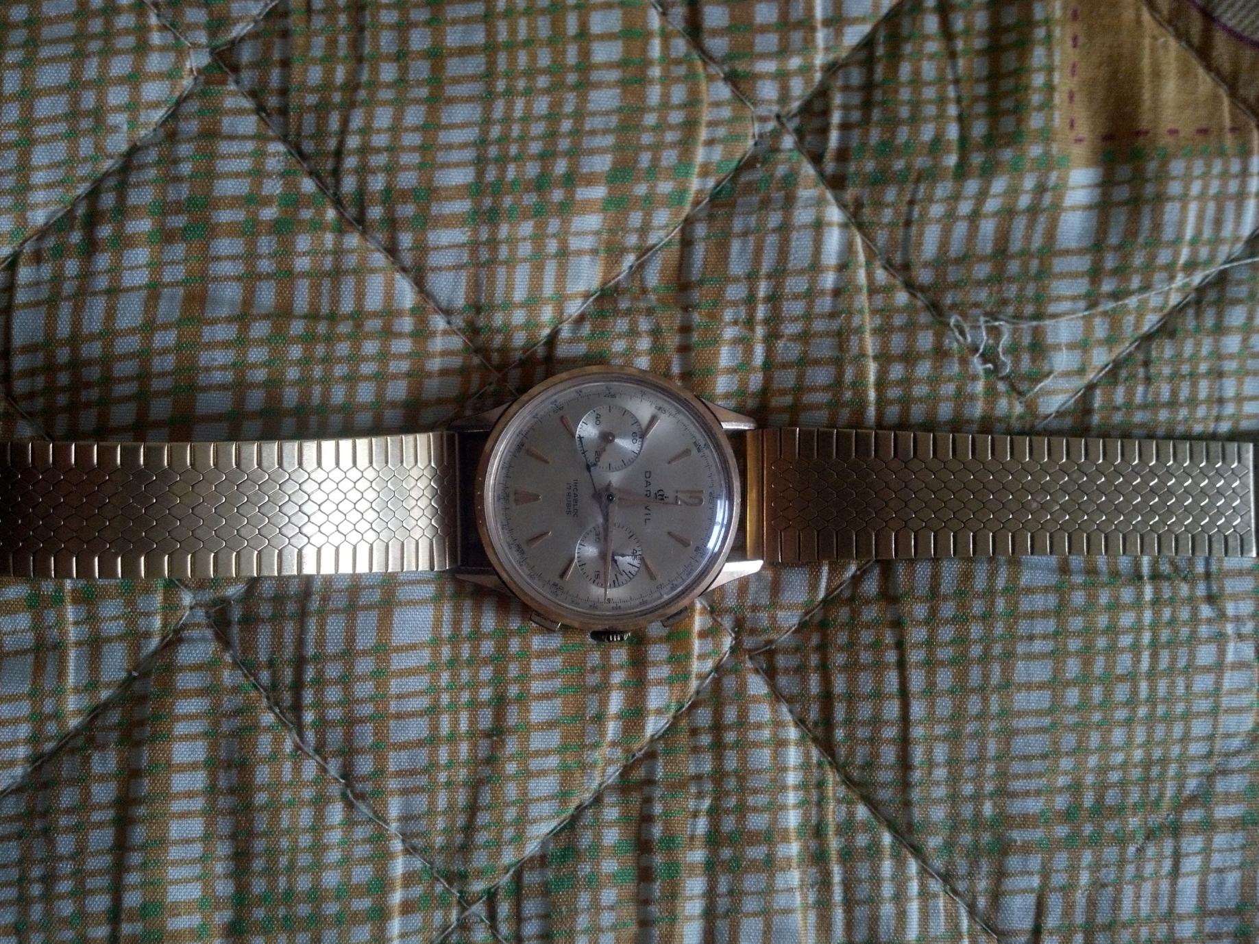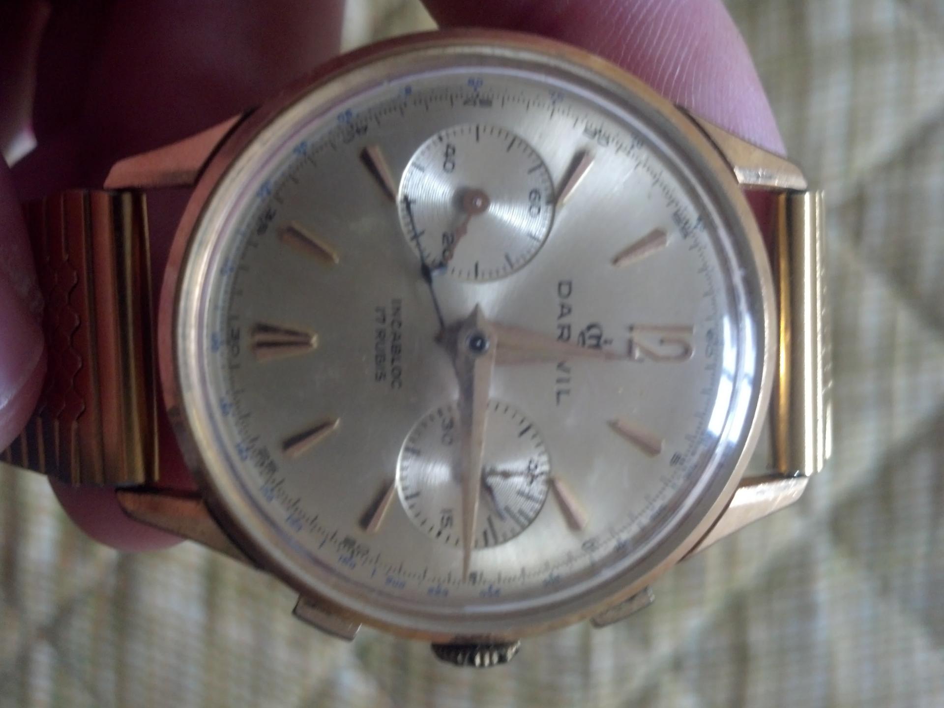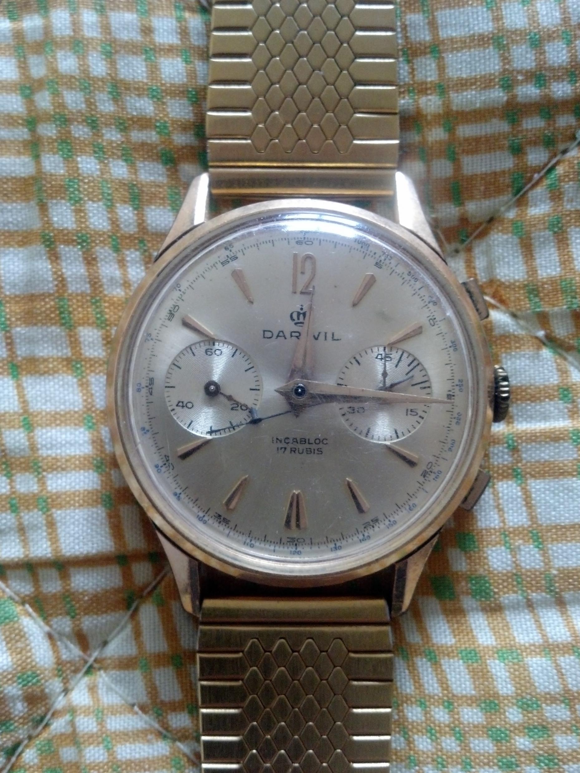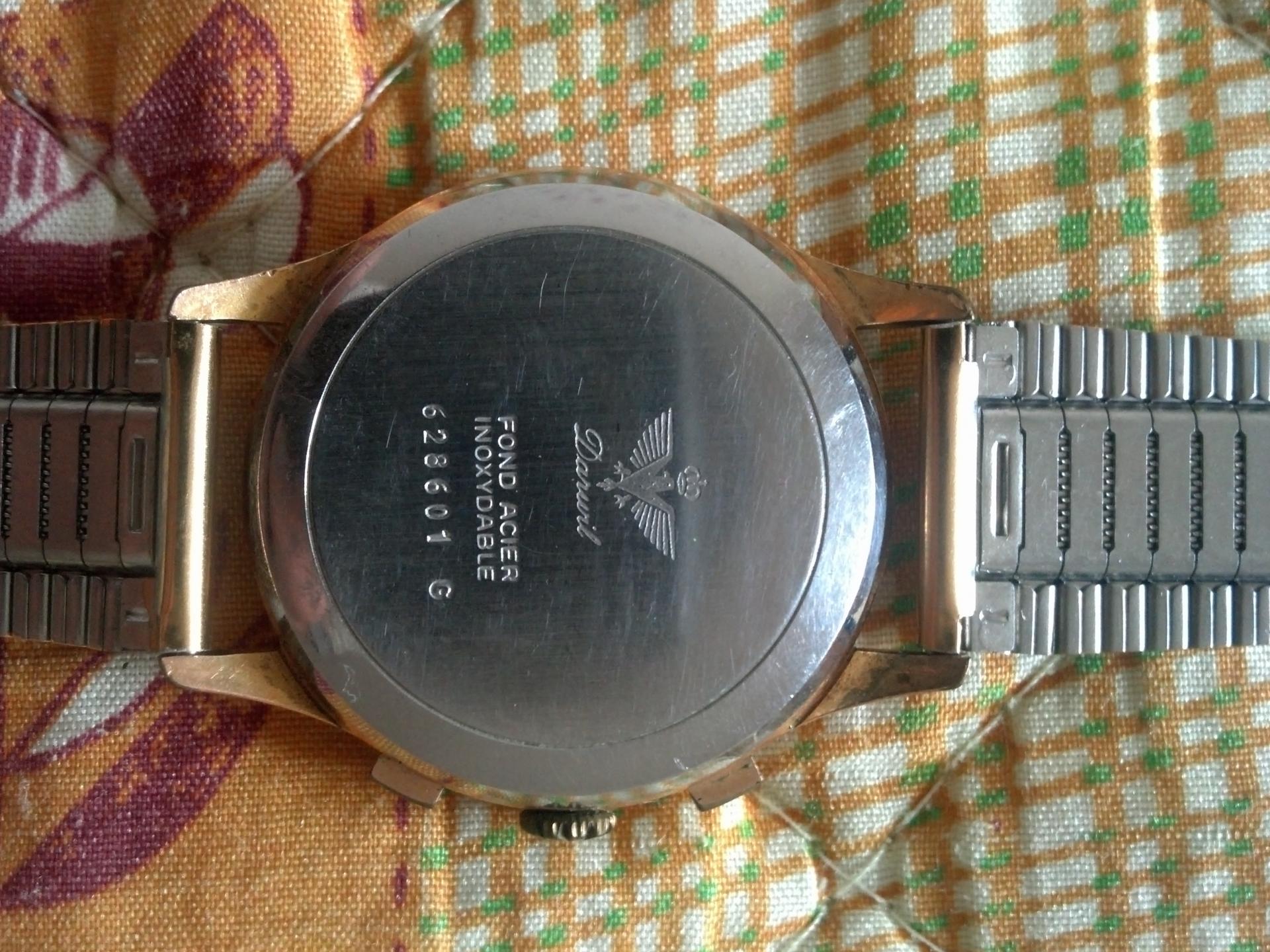 Vrlo lep, dobro očuvan i poprilično redak Darwil . Koliko je tačno star, nisam siguran. Mehanizam je Landeron 149. Ovde imaš sve o mehanizmu bidfun-db Archive: Watch Movements: Landeron 149 . Kao što vidiš mehanizam je proizvođen do 1970. što znači da je taj sat star najmanje 43 godine a vrlo verovatno i više od toga.