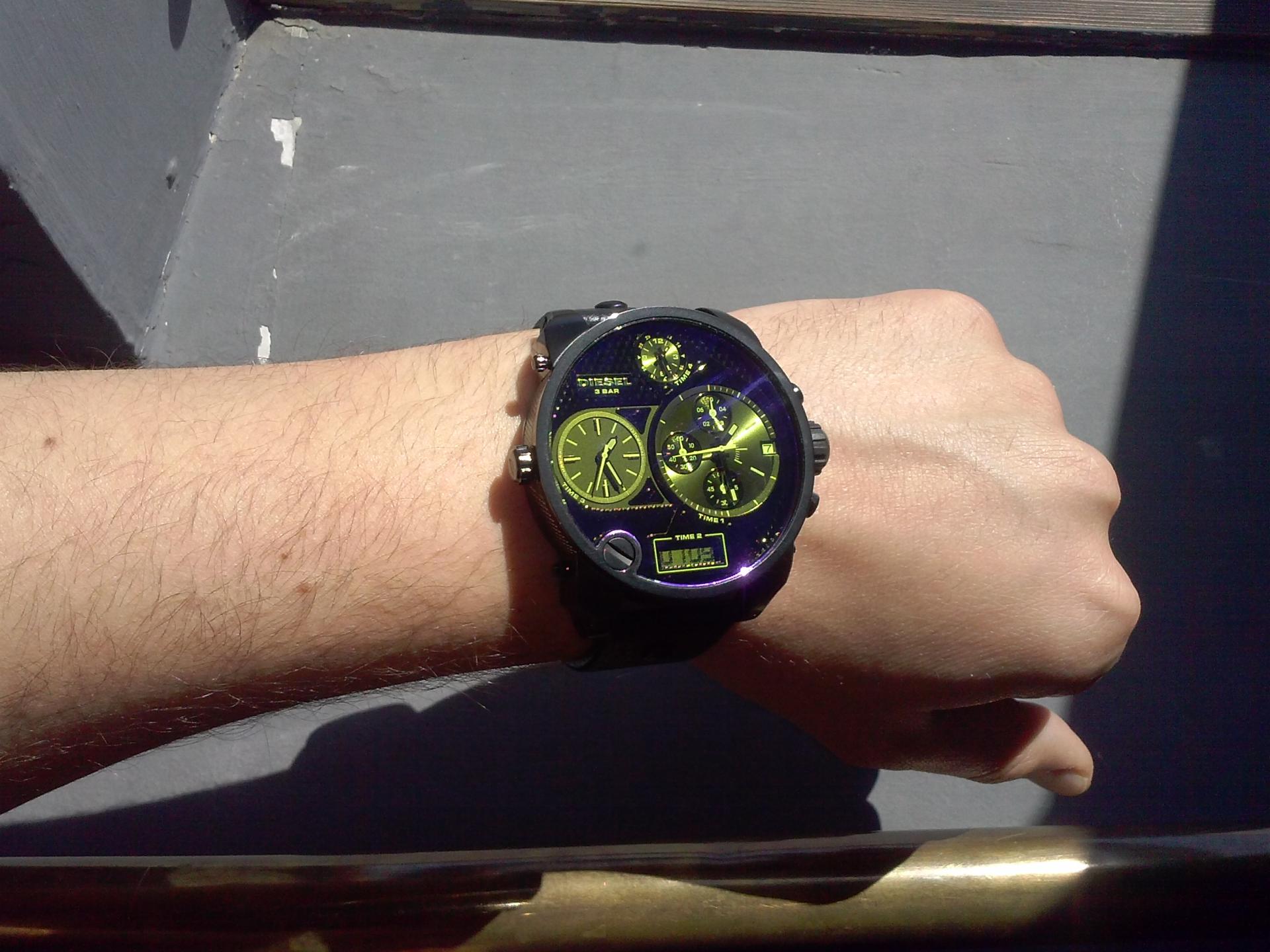 Sat nije moj ali je nesvakidasnji pa utiske htedoh podeliti sa vama.. U pitanju je Diesel Big Daddy. Ovaj sat sam kupio bratu ne bi li pamtio dan kada je diplomirao. Sat je jako veliki..57mm.. na mojoj ruci to ne izgleda toliko veliko s obzirom da sam velik covek ali se to tek vidi na slici gde stoji pored njega Wyler Vetta od 40mm... Ima 4 vremenske zone, stopericu i dan u mesecu i za to koristi 4 baterije :/ nece se bas radovati promeni istih ali sta da se radi... poklonu se u zube ne gleda ;)... uzivajte