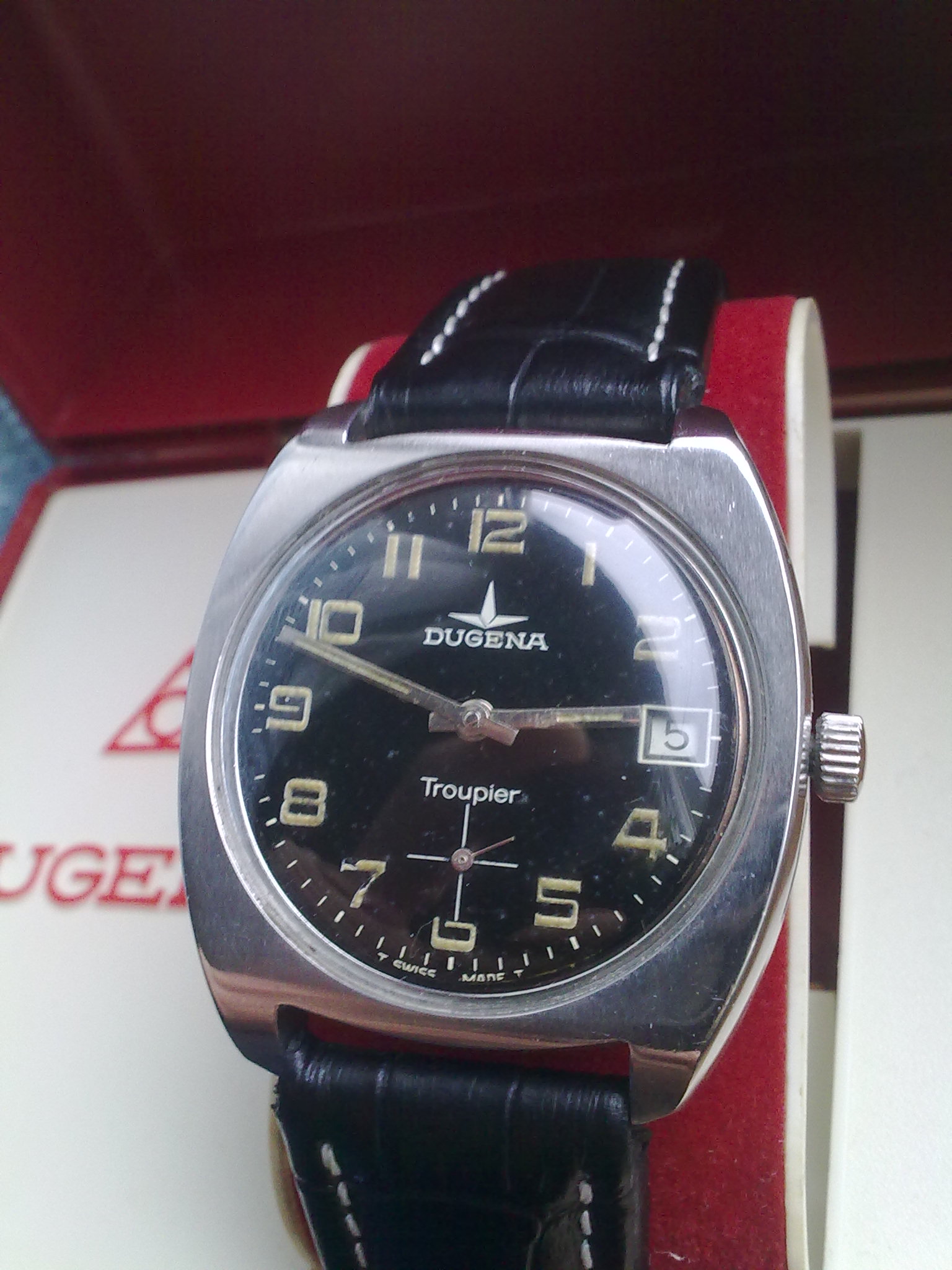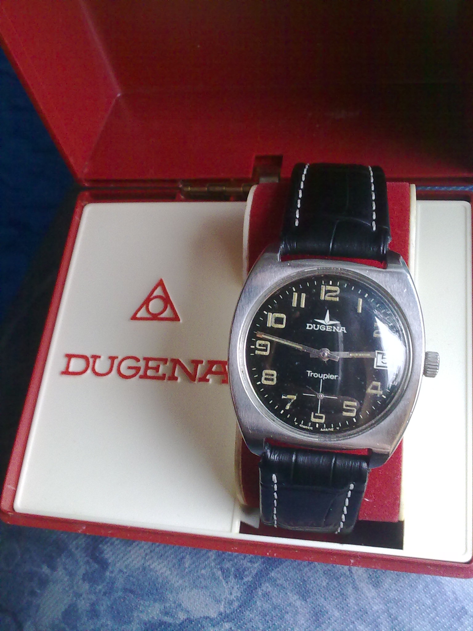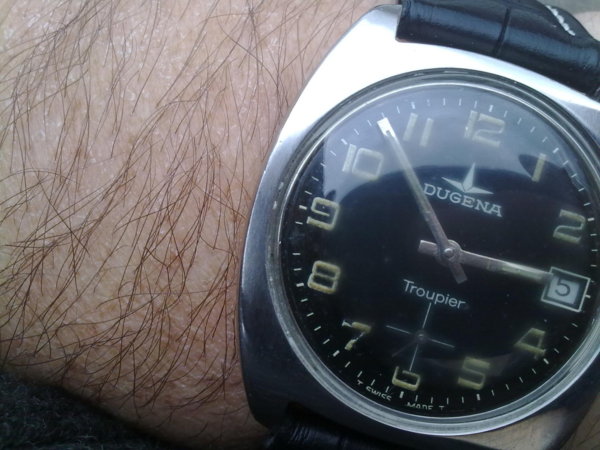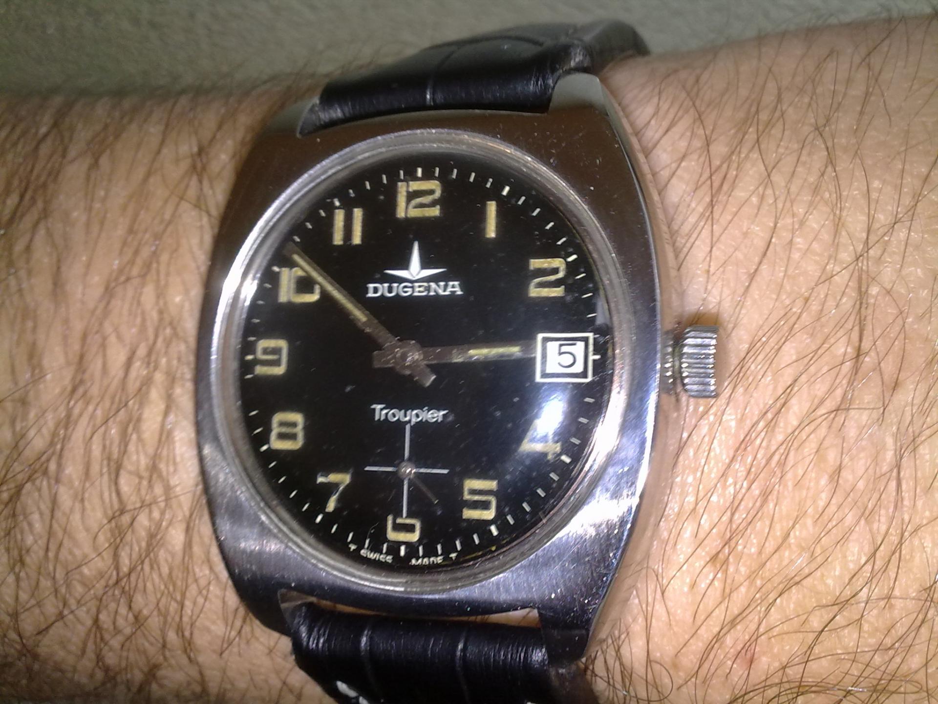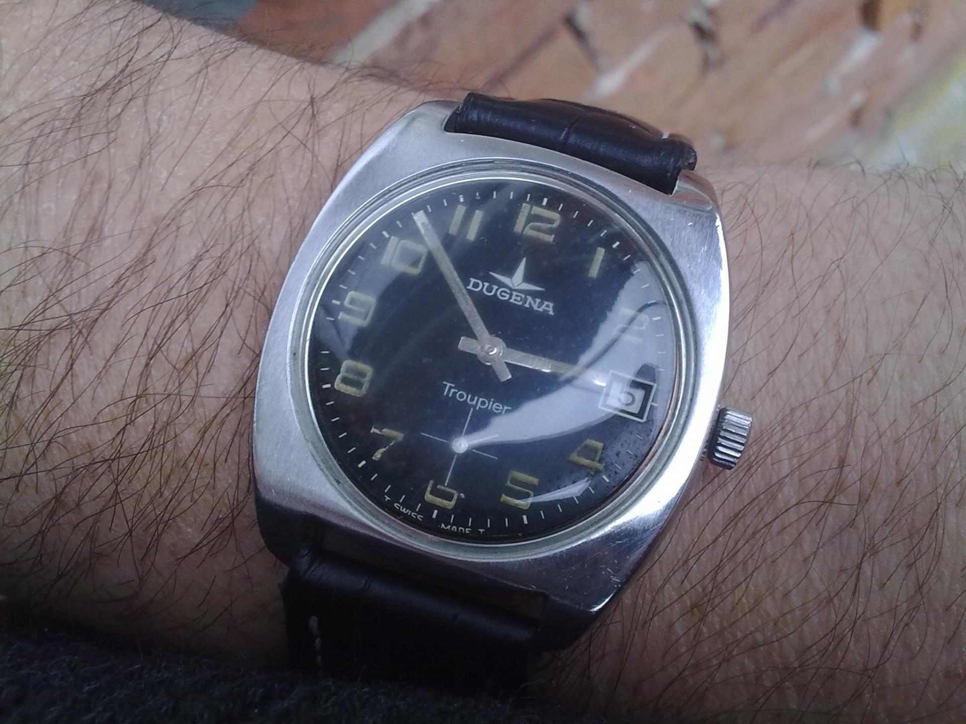 Napokon jedna prava prinova i to nemac sa svajcarskim korenima(Deutsche Uhrmacher Genossenschaft Alpina) Dugena Troupier. Unutar ovog policajca ili vojnika kuca Dugena 3910 mehanizam sa 17 rubina na bazi unitas 6325.Precnik sata je 3,9cm sa krunicom a sto se tice rezerve snage od oko 48 sati provericu pa javljam.Inace koliko sam uspeo da vidim na netu obicno se nalaze bez datuma i sa belom masinom sto kod ovog nije slucaj.Prilog 119938 Prilog 119939 Prilog 119940 Prilog 119941 Prilog 119942 Prilog 119943