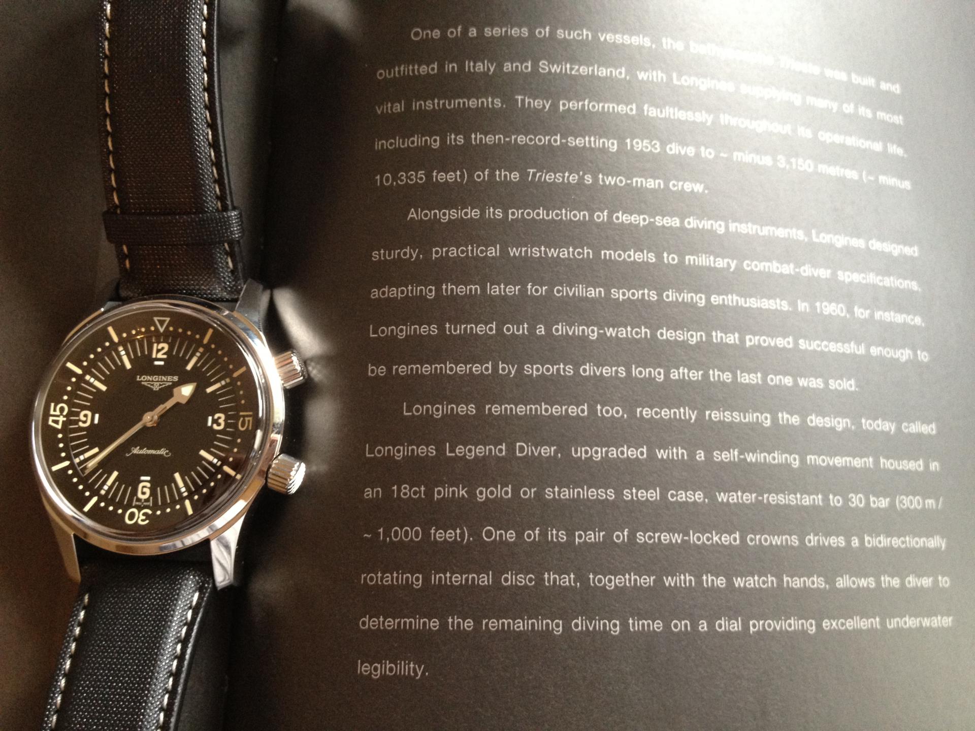 evo malo povjesti o ovom satu ,LONGINES legend diver no date pripada kolekciji heritage, to je kolekcija koja radi obnovljene stare modele longines satova longines je ranih 50 radio instrumente za razne stvari a medju njima i mjerne uredjaje za podmornice, tako je mislim 1953 napravio podmornicu Trieste i u njoj postavio svoje mjerne instrumente, vidjevsi da mogu radit kvalitetne mjerne instrumente za podmornice 1960 su dosli na ideju napravit prvi ronilacki longines sat za ronilačke entuzijaste.... ovo je malo redizajniran model a poslije njega postoji model sa datumom koji je izasao prije 2ili 3 , godine ako se ne varam , vecina ljubitelja ovog sata preferira verziju bez datuma zato sto je originalnijeg izgleda , ako grijesim molim da me netko ispravi ili jos ponesto doda. nadam se da sam malo pomogao u shvacanju povijesti sata. evo jedna moja slika sa tekstom iz longines knjizice , hvala puno na lijepom komentaruLONGINES LEGEND DIVER  no date-img_0291.jpg