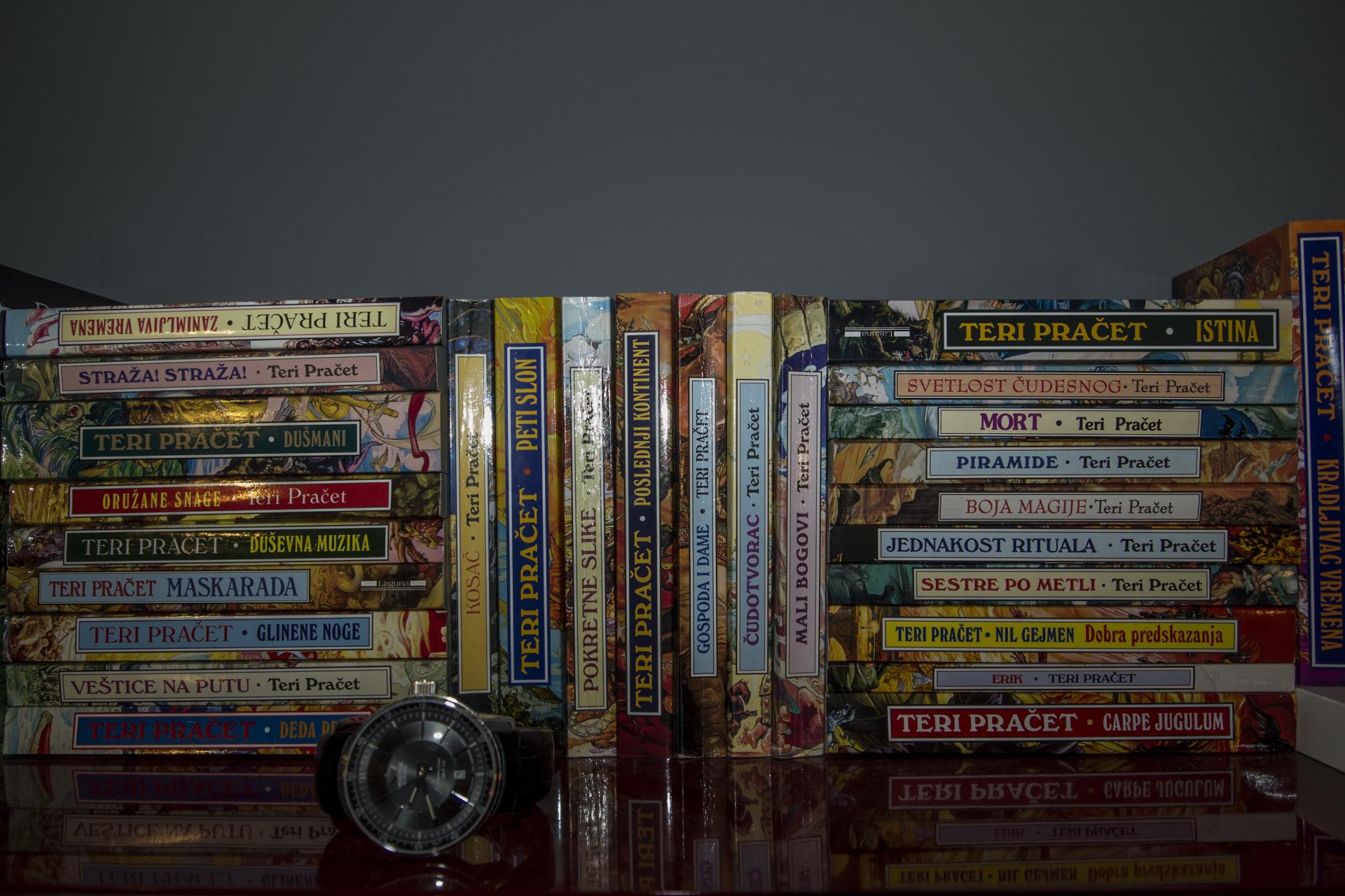 Naše su uglavnom naučna i epska fantastika i pisci poput Hesea, Umberto Eko, Markes, Koeljo (pogađajte koje su čije knjige), a od dede mi je ostala svetska književnost (da ne kažem Rusi) i dosta enciklopedia. Za njih, na žalost, nemam mesta u stanu.