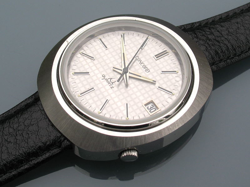 Dakako, Concord manufaktura postoji i proizvodi i dan-danas. Ipak, ovdje ćemo se osvrnuti na jedan njihov vrlo rijedak model predstavljen na Baselworldu 1972 g. pod nazivom Concord µ-Quartz. Ovaj sat pokreće Golay FB7723 elektro-mehanički kvarcni mehanizam. Podsjetimo, ovi mehanizmi funkcioniraju tako da balansni kotačić oscilira sinkronizirano s impulsima kristala kvarca. Sat također karakterizira neobično dizajnersko rješenje imanja dvije krunice. Jedna je postavljena sa strane i služi za namještanje datuma dok je druga namijenjena pomicanju kazaljki postavljena s donje strane na poklopac sata. Kako ovaj model nije proizveden u velikom broju nije lako doći do njega i kao kolekcionarski primjerak je vrlo privlačan.