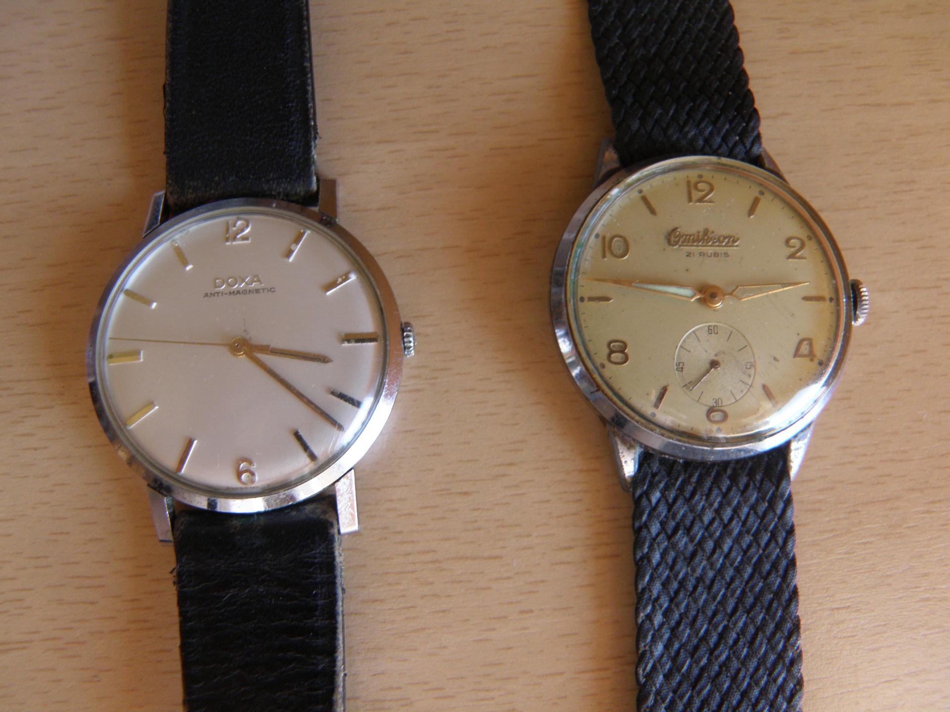 Nedavno sam dobio dva starija sata, jedan sat je Doxa, a drugi Omikron. Doxa je u sasvim solidnom stanju spolja, ali zato nije tačan, tj žuri, i to poprilično. Omikron, sa druge strane je tačan, ali je u lošem stanju spolja. Takođe, mislim da je na Omikronu krunica menjana zato što se malčice klima. Primetno je žući, mislim da nije staklo u pitanju, već brojčanik. Kaiševi će biti promenjeni u svakom slučaju, dosta su stari i pohabani.