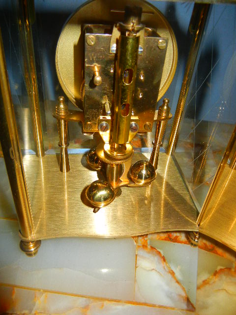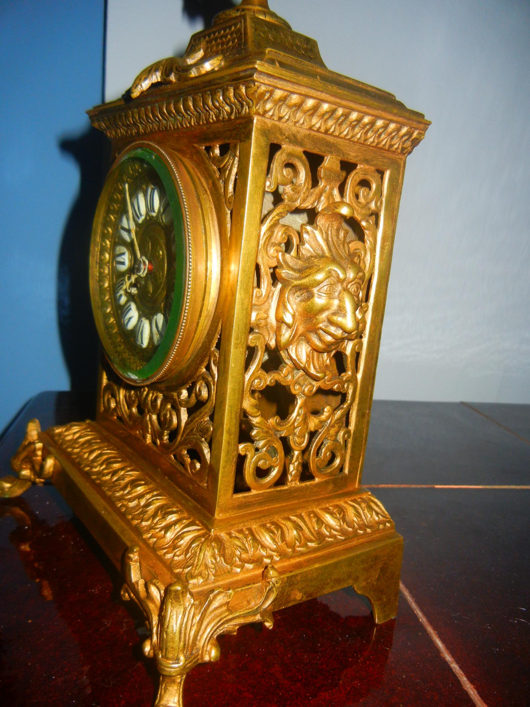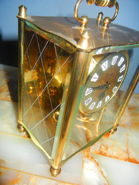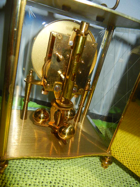 stolni dekorativni sat francuske manifakture, sa diskretnim zvonom, osmodnevni, brušeno staklo, keramički brojevi, puni mesing, oko 1850.