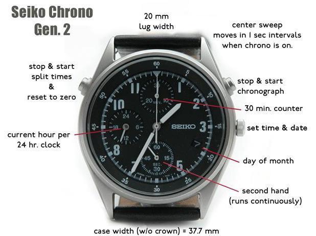 Merni opseg hronografa ovih satova tj.mehanizma 7T27 jeste 29 minuta i 59 sekundi. Centralna sekundara je sekundara hronografa, gornji podbrojčanik je 30-minutni registar hronografa. Podbrojčanik na poziciji broja 9 služi za 24-časovni prikaz vremena tj. AM-PM funkcija ili kako još vole da kažu to je vojni prikaz vremena tzv. military time. Gornji desni taster služi za startovanje i zaustavljanje hronografa dok levi gornji taster služi za tzv. split funkciju ( zaustavljanje kazaljke hronografa bezprekida merenja ) i za resetovanje na nulu. Takođe treba primetiti da postoji prikaz datuma.