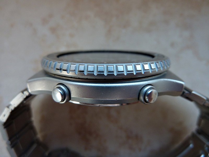 Kao što se vidi sa fotografija,hronograf sata može da meri 29 min, 59 sek i 9 desetinki. Gornji desni taster služi za startovanje i zaustavljanje štoperice. Donji taster je za resetovanje na nulu. Gornji levi taster je interesantan . Pritiskom na gornji levi taster zaustavljaju se sve kazaljke hronografa ali nije zaustavljeno merenje tako da ponovnim pritiskom na gornji levi taster kazaljke hronografa nastavljaju da mere od tamo gde bi inače bile da nisu prethodno zaustavljene. Drugim rečima ako startujete štopericu i posle 5 sekundi pritisnete gornji levi taster i sačekate npr. 5 sekundi a onda ponovo pritisnete gornji levi taster , kazaljka će nastaviti merenje od 10-te sekunde a ne od 5-te sekunde, dakle proces merenja nije prekinut. To je tzv. „splitfunkcija“ i pomoću nje praktično možete meriti više prolaznih vremena. Sa donje leve strane nalazi se krunica.