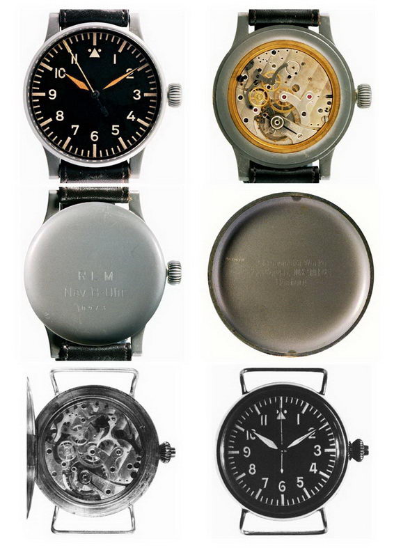 Jedna fotografija gde se vide satovi svih proizvođača koji su pravili B-Uhr satove ( gore levo-L&S ; gore desno- Laco ; sredina- IWC ; dole levo – Wempe ; dole desno- Stowa ) .