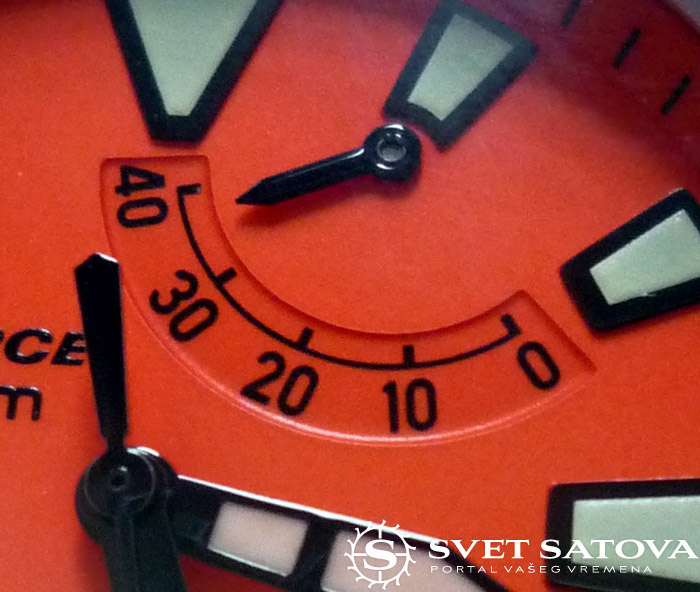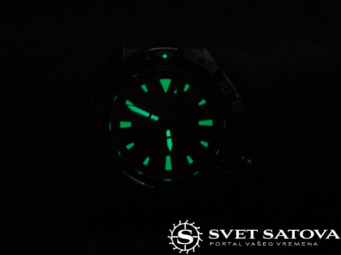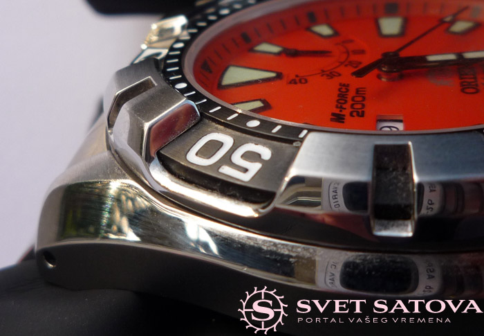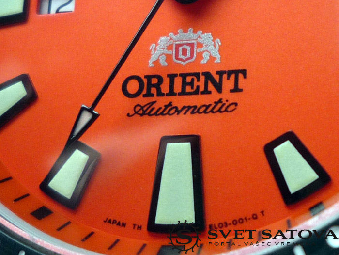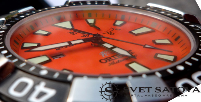 …jako pregledan, bez nepotrebnih detalja. Markeri trapeznog oblika, sa nanesenim iluminacionim slojem. U donjem delu , kod polozaja 6, nalazi se natpis proizvodjaca, kao I logo, kojeg se Orient ne odrice I dalje, uprkos mnogobrojnim kritikama. Meni licno, ne smeta. Nije mi ruzan, nije ni visak. U nesto svetlijoj boji je stampan, pa nije ni uocljiv previse. Osim toga na brojcaniku je prisuran natpis serije “M Force”, kao I deklarisana vodootpornost, datum na poziciji 9, kao I indicator rezervne snage. Brojcanik je pedantno uradjen, sve je japanski precizno odradjeno, satni markeri su apsolutno stoprocentno simetricno postavljeni u odnosu na minutne podeoke na ovom prstenu unutar brojcanika. Indikator rezervne snage takodje, kada je potpuno navijen, stoji tacno na 40, kada je prazan, stoji na 0. nema da prelazi na bilo koju stranu. Jos jedan dokaz o kvalitetu obrade ovog sata… Iluminacija je dobra. Jako citljiva, verujem da nije kao na monsteru, ali vise nego zadovoljavajuca. Iluminacija bi mozda mogla da traje malo duze, nece trajati celu noc, ali se nece izgubiti kao na MAko modelu, recimo. Ni toliko brzo, ali ni u tom intenzitetu…