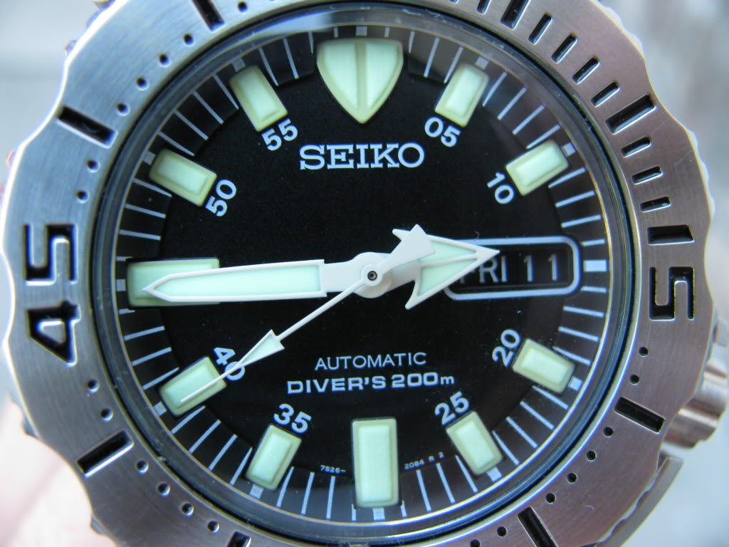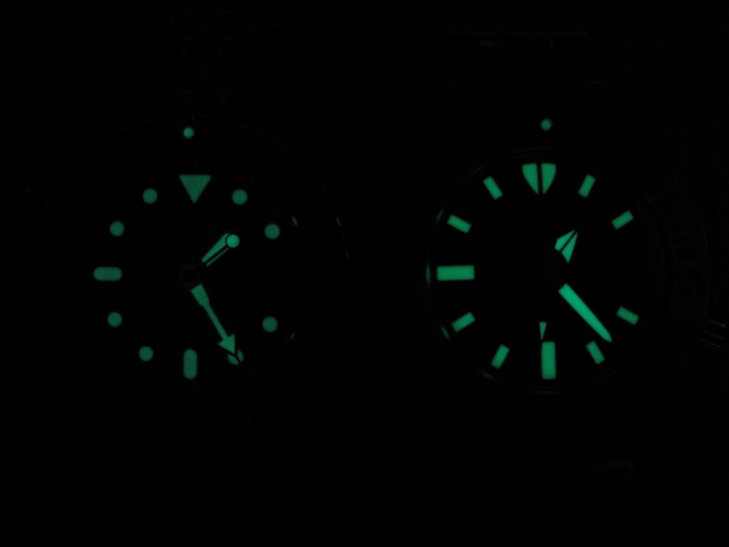 Oba sata su veoma čitka u skladu sa svojom namenom. Čitkost je postignuta masivnim kazaljkama bele boje koje daju odličan kontrast na crnom brojčaniku ( postoje i varijante s narandžastim brojčanikom ). Markeri su takođe masivni. Materijal koji se koristi za osvetljenje kod oba modela jeste Seikov Lumibrajt ( Lumibrite) premaz. Tu dolazimo do kvalteta osvetljenja. Treba odmah naglasiti da su oba sata lako čitka u mraku, naravno ako su pre toga bili pod nekim izvorom svetlosti. Međutim ovi satovi nemaju isti kvalitet osvetljenja. Razlog, po mom mišljenju, leži u debljini svetlećeg sloja. Razlika se najlakše vidi na satnim markerima. Kod Monstera markeri su bitno deblji , izdignutiji u odnosu na 007-cu. Kod Monstera i sa manje distance primeti se da su markeri izdignuti dok su kod 007-ce markeri na prvi pogled praktično ravni. Tek kada se malo bolje zagledate vidi se da su i oni malo izdignuti. Rezultat svega toga je da Monster bolje svetli u mraku i dovoljan mu je slab izvor svetlosti da sasvim dobro svetli u mraku ( npr svetlost sa monitora ili tv ). Nemam potrebnu opremu da bih mogao reći koliko tačno jače svetli Monster ali po slobodnoj proceni rekao bih otprilike 15 do 20 % jače. To se i vidi na fotografiji . Treba naglsiti da su oba sata stajala na suncu oko 5 minuta, nikakava posebna podešavanja fotoaparata nisu vršena jer nerealno blještavilo koje se često može videti na Internetu ne daje realnu predstavu kvaliteta osvetljenja.