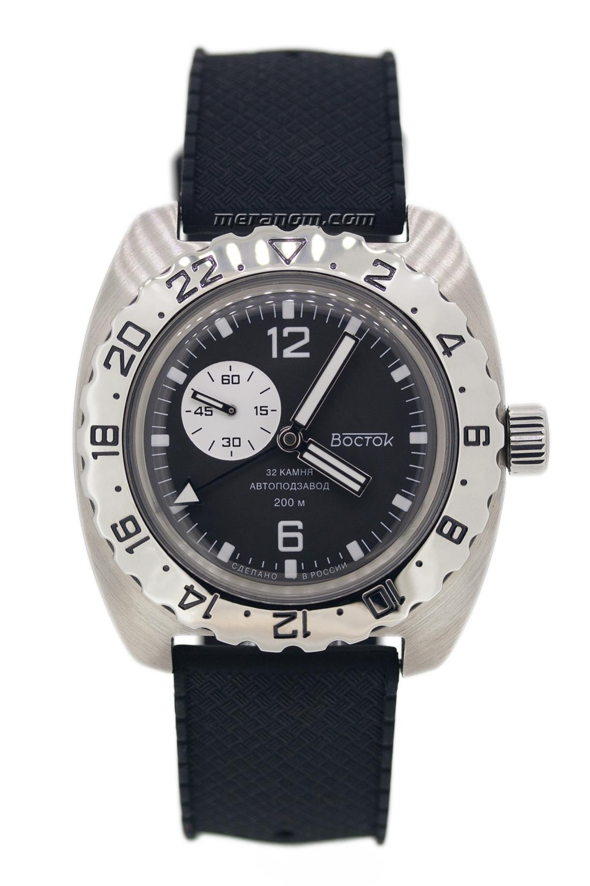 Bezel pokretan u oba smera bez klikova od poliranog celika(kao i krunica) sa oznakama 0-24.Bezel je otprilike novi stil jer do sada nisam video ni na jednoj drugoj Amfibiji koji pravi lep kontrast sa brusenim kucistem.Cifer je lep,pregledan crni sa sa belim subdialom za sekunde na kome su brojevi 15,30,45 i 60 na poziciji 10, nazivom Vostok na poziciji 3 i brojevima 6 i 12 na odgovarajucim mestima.Iznad broja 6 je ispisano 32kamena,avtopodzavod i deklarisana wr.Kazaljke takozvane veslo su lepe i ispunjene iluminacijom gde jos postoji i GMT kazaljka gde je na vrhu strelica sa iluminacijom.Iluminacija je na kazaljkama dosta bolja nego na markerima.