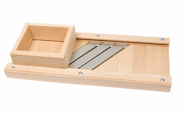 U principu izgleda kao ovaj na slici. Kuvana bukovina i izuzetno kvalitetni noževi. Noževi su ono što najviše pravi razliku između dobrog i lošeg ribeža. Ima ribeža sa noževima od lima ali to nije to, kao na primer limene i kovane kose-razlika je kao nebo i zemlja.