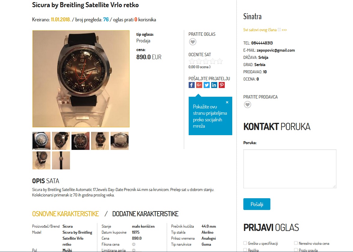 Niti sat ima veze sa Breitlingom, niti cena ima veze sa realnošću niti je malo korišten, kao što kaže prodavac (pogledati iskrzani hrom na drugoj fotografiji), a ne znam ni otkud da je limitirana serija. Nije to baš bio jak brend pa da izbacivao ograničene serije. Ni kućište nije od čelika kao što prodavac tvrdi. Čovek ništa nije pogodio. Važno je skrojiti priču i zviznuti cenu.