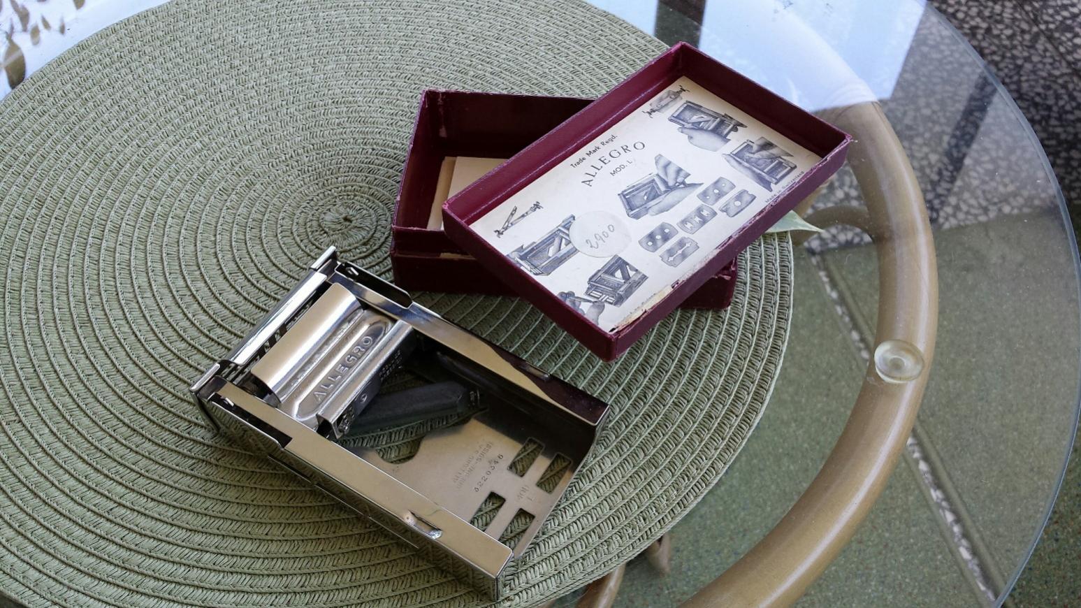 Rekao bih da je ovo Allegro masinica za ostrenje zileta,Svajcarske proizvodnje, uredno sa prevodom i uputstvom.Nisam se mnogo udubljivao jer je kod roditelja pa sam samo napravio par slicica.Meni deluje cak i nekoriscena ....mehanizam radi e sad da li ostri zilete ne mogu proceniti...
