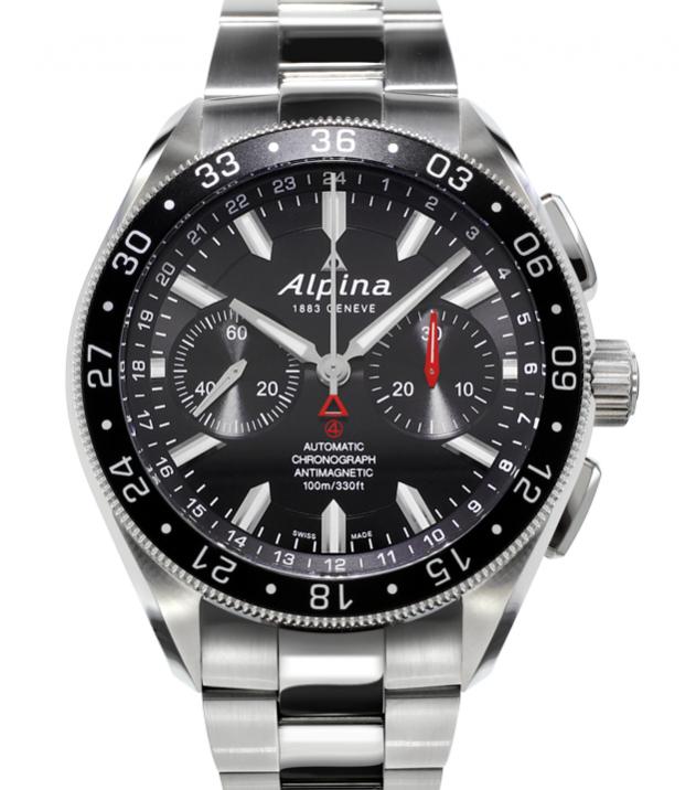 Sand-blasted stainless steel; anodised aluminium red reset button; fluted bezel with inlaid red marking; convex, internally anti-reflective sapphire glass; screwed-down, internally anti-reflective sapphire glass case back; large screw-in crown; flexible lugs; diameter 44 mm, height 15 mm; water-resistant to 10 bar/ 100 m