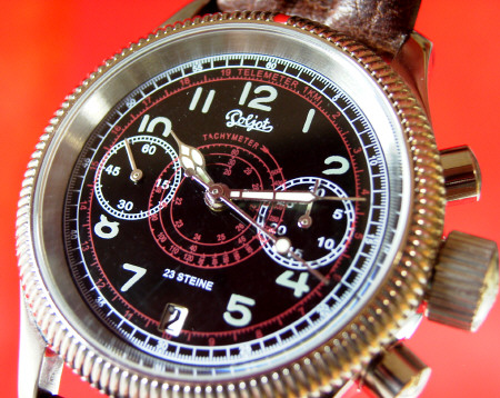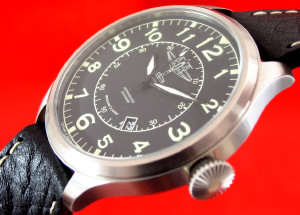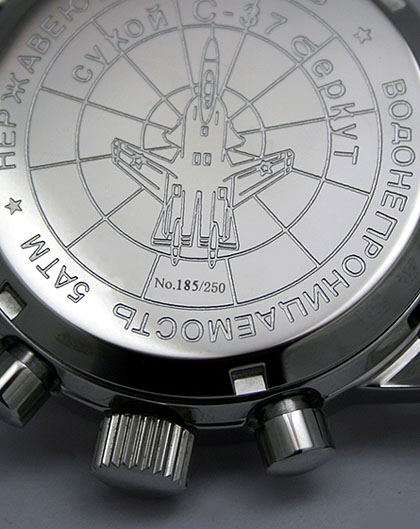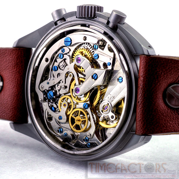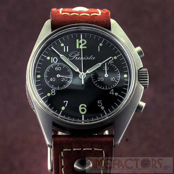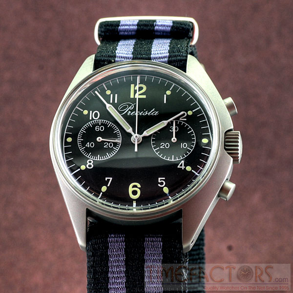 CASE Material 316L stainless steel, bead blasted Diameter 41mm across including crown, 37mm top to bottom Lug to lug height 45.5mmThickness 14.75mm to the top of domed crystal Lug spacing 20mm Anti-magnetic 4800 A/m Water resistance 50 metres Weight 60 grammes without strap Features Screw back, drilled lugs DIAL Colour Semi-matte black Luminous Hour dots, 12 & 6 Super Luminova C3 Day/Date None HANDS Style White painted, luminous filled Luminous Super Luminova C3 CRYSTAL Hi-dome acrylic MOVEMENT Seagull ST-19 column wheel hand-wind chronograph BATTERY N/A STRAP