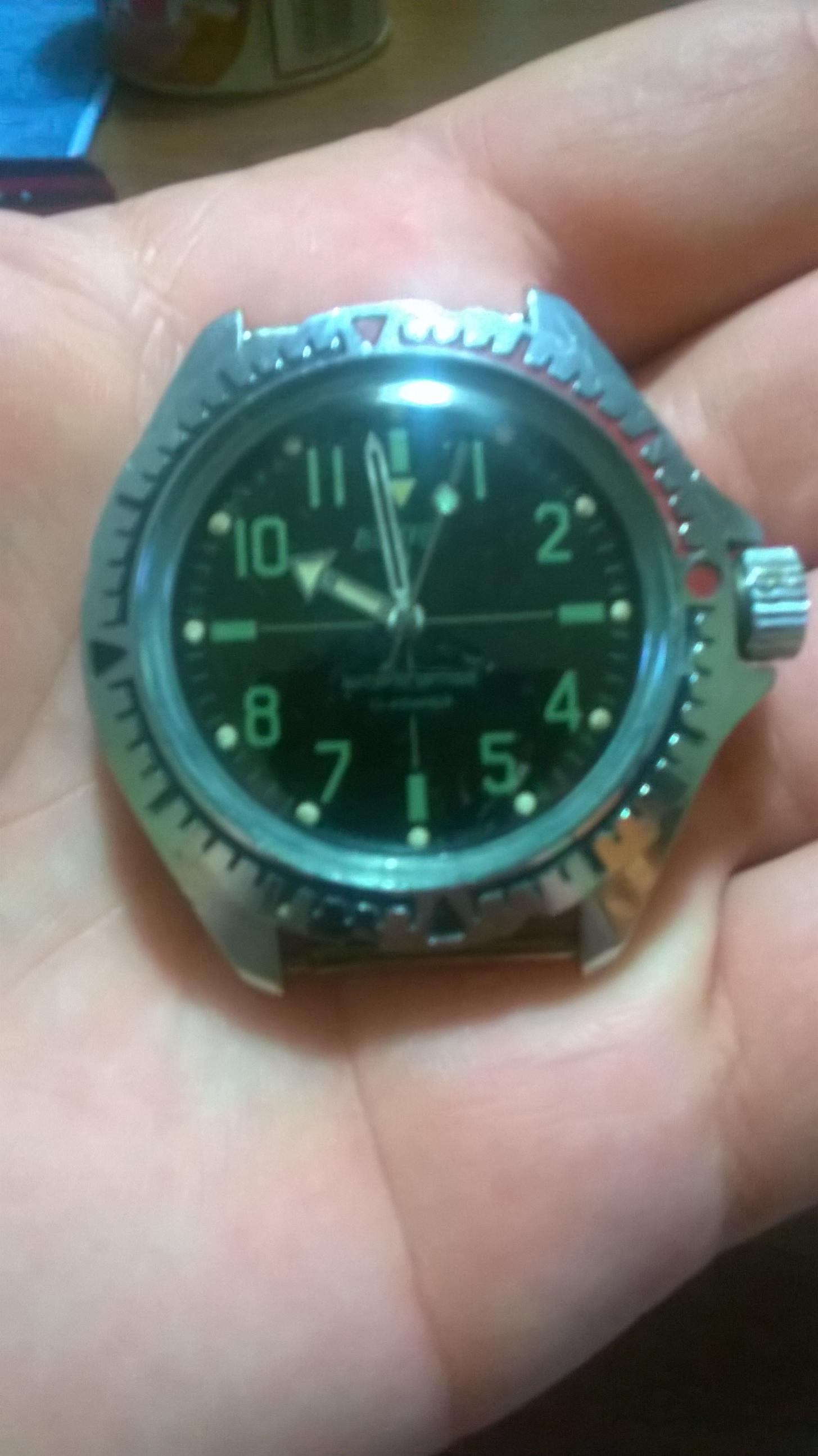 Evo da se pohvalim, nakon otkaza kupovine Juniora zbog dimenzija, konačno sam postao vlasnik, slobodno mogu reći ponosni, jednog Vostok-a, po mom zaključku frankenštajna, bar bih tako rekao iz silnih tekstova isčitanih na ovom forumu, posebno bih ovom prilikom zahvalo Sky-u i njegovim tekstovima koji su me naveli na kupovinu Vostok-a, koga sam jurio duže vreme po domaćim oglasima. Kako sam sat kupio samo sa par slika, ne preteranog kvaiteta, nisam znao šta da očekujem, iskeno potajno sam se nadao da je u pitanju Amfibija, što zbog cifera bez datuma, što zbog kazaljki, ali ipak ispade bar po mom mišljenju formiranom na osnovu onoga što naučih na forumu franki - komandirski,ukoliko grešim, što je vrlo moguće, slobodno me ispravite. Stanje sata je solidno, bar ovo vidljivo, navija se normalno, videću kako će se pokazati u radu. Ono što je bilo veliko razočaranje je pogrešna informacija prodavca o širini lugova, javio mi je da je merio lenjirom 23mm, ja se ponadah da je u pitanju kućište 110, ali ipak je izgleda 060, pa će nažalost Nato 22m uzet od kolege Milana za sad ostati u fioci(pozdrav i za Milana