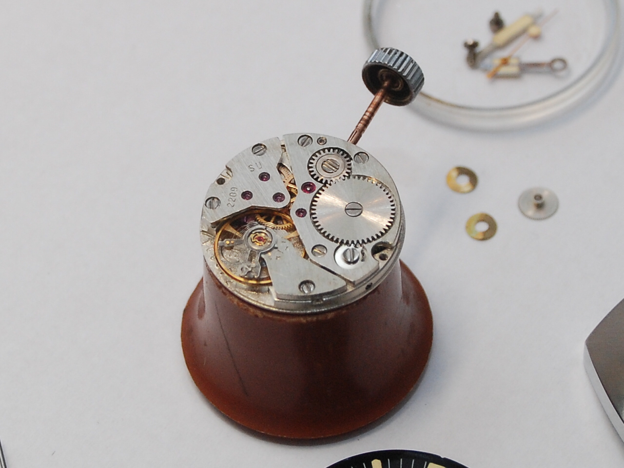 dalje vidimo sastavljen mehanizam spreman za montažu u kućište inače da dodam da je na satu sve originalno sem krunice koja je stavljena od malo novijeg modela kako bi bila čelična jel ovaj model ima hromiranu...