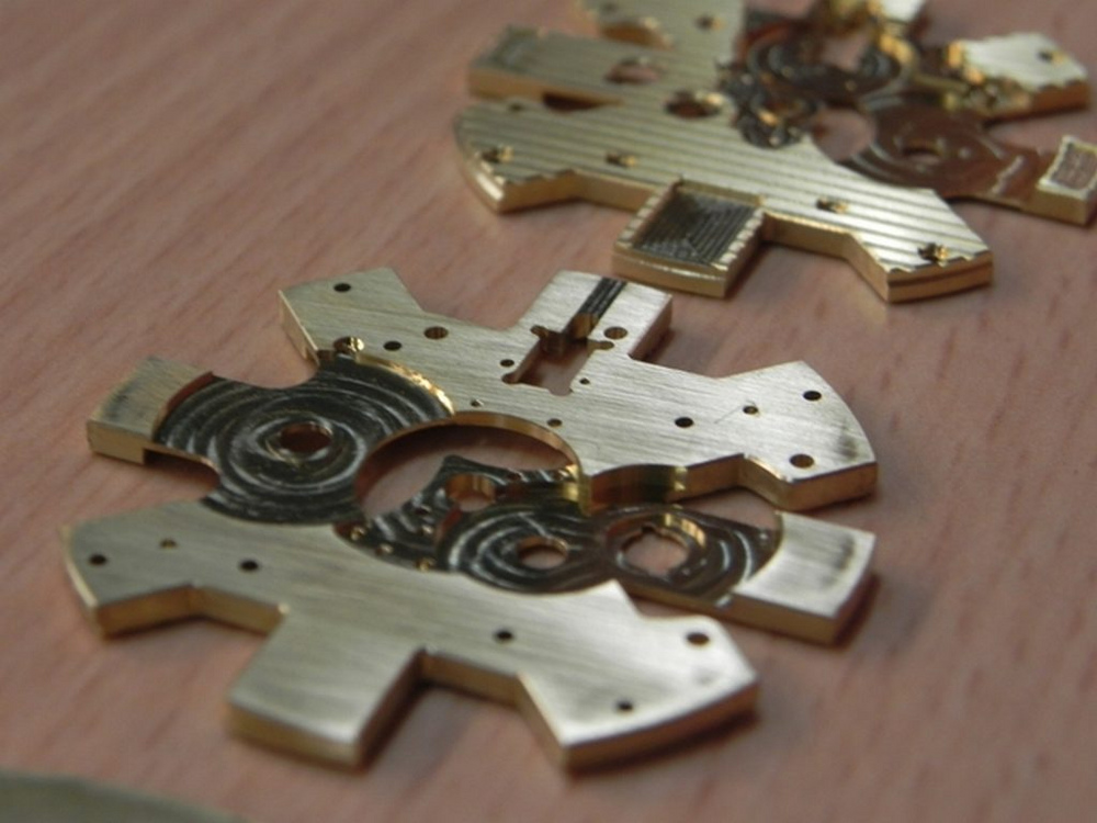 Once all the parts are cut out and set, the bridges can be finished. Then, the electroplating is performed. Finally, all the blackened parts are ready to be fitted together.