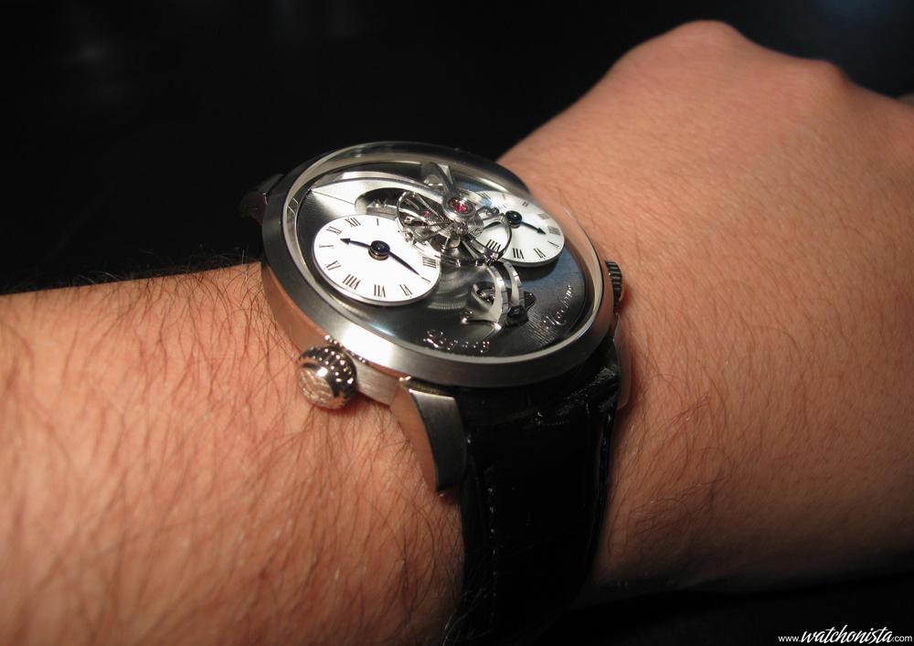 The two dials feature two different time zones, totally independently adjustable; hence the right dial can be set at 10:10 while the other is set at 11:22.