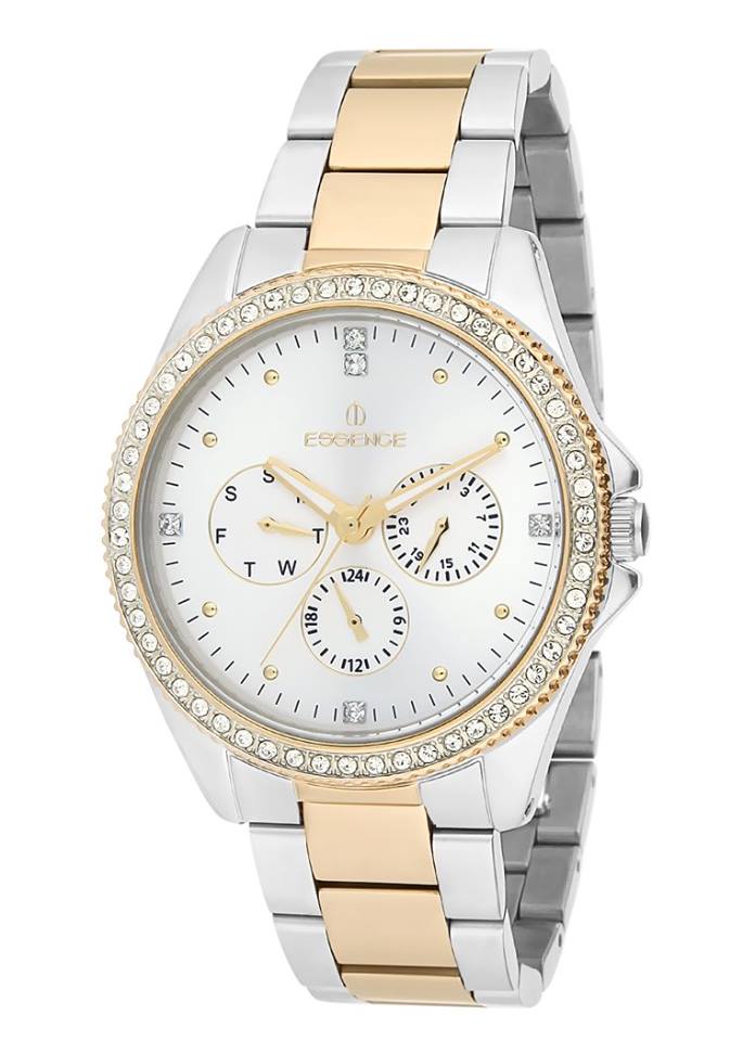 Atraktivni ženski časovnik sa kombinacijom boja čelika i zlata, sa dodatnom dekoracijom u vidu cirkona.