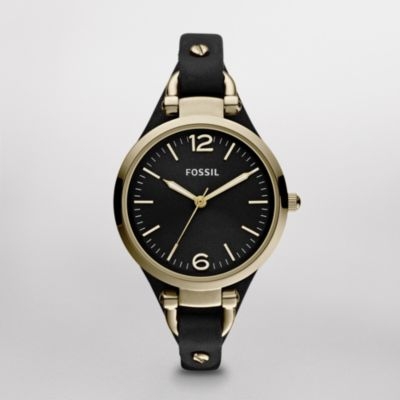 Klasičan Georgia sata karakteriše dominantno kućište u zlatnoj boji i crna kožna narukvica.