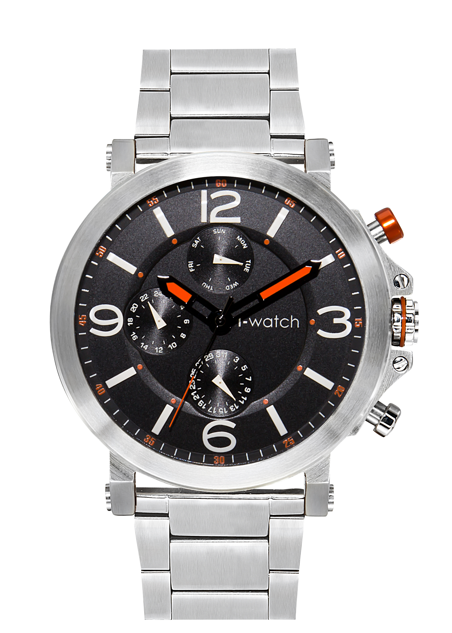 Multifunkcijski muški časovnik sa detaljima u narandžastoj boji. Sat poseduje 24-časovni prikaz vremena.