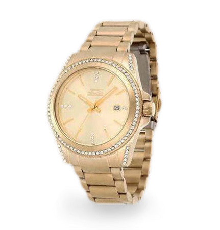 Ženski časovnik u boji žutog zlata, dodatno dekorisan kristalima.