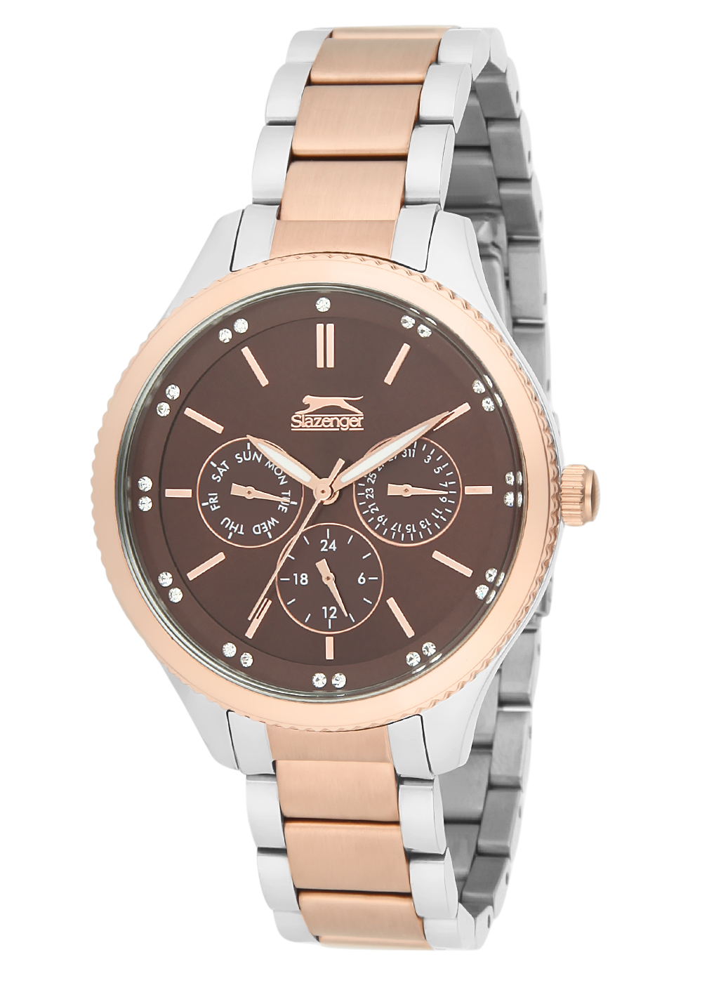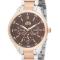 Ženski časovnik sa kombinacijom boje čelika i žutog zlata. Cifer je u boji čokolade dodatno je ukrašen cirkonima.
