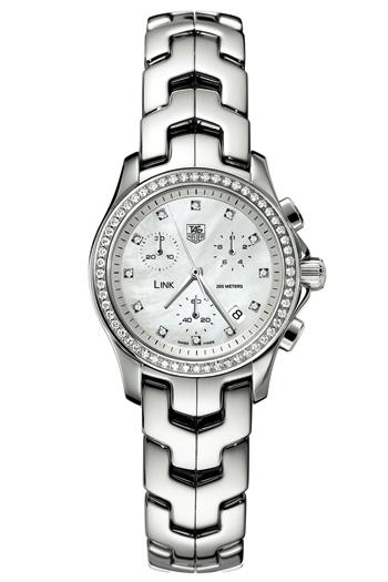 S-Link narukvica, Centralna sekundara, Tri podbrojčanika, Beli sedef brojčanik, Prikaz datuma na poziciji između 4 i 5 sati, Satni markeri obeleženi sa 12 dijamanata 0,114 ct, Rodinirane kazaljke, Korona dekorisana sa 56 dijamanata 0,8 ct