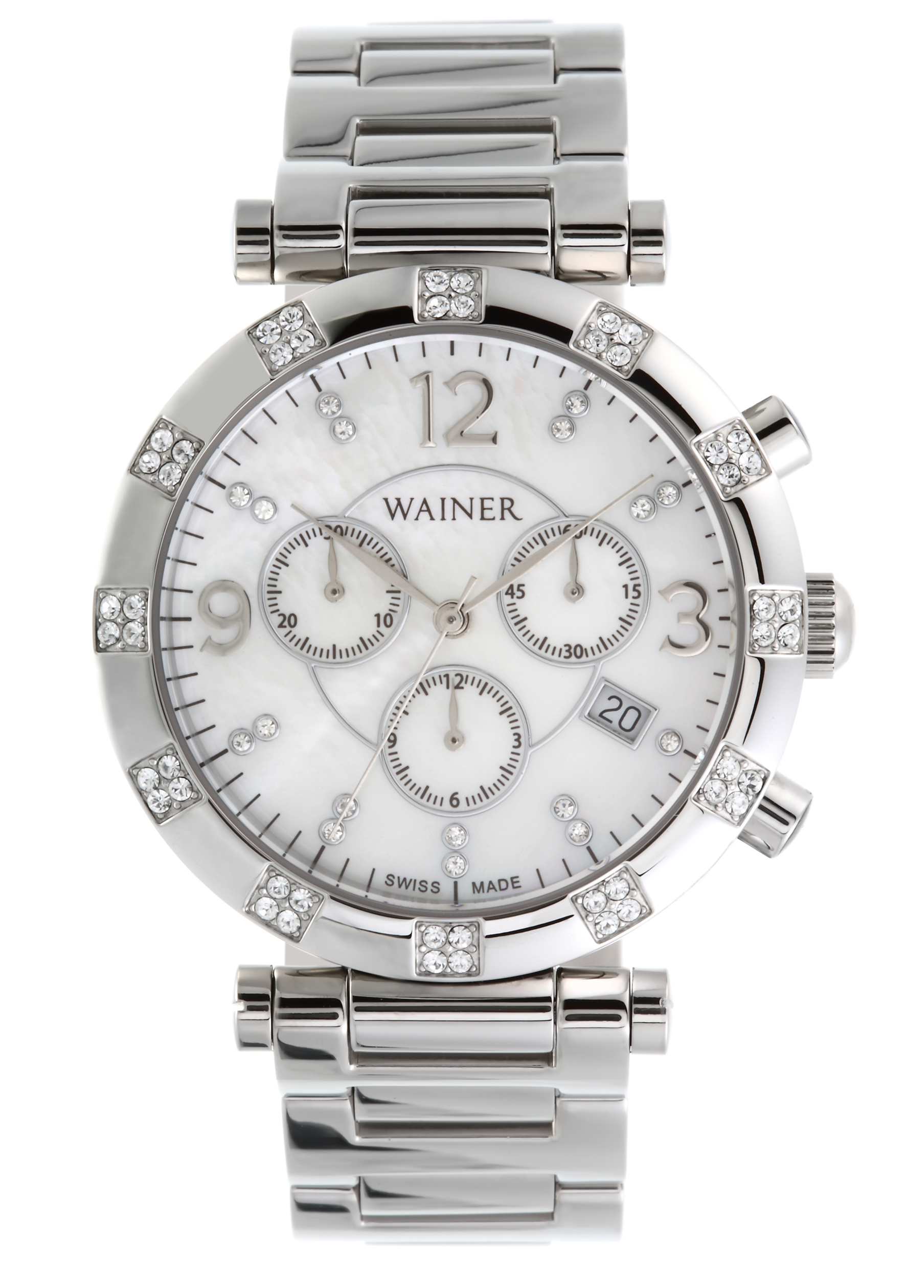 Ženski časovnik sa potpisom Swiss Made. Dodatno je dekorisan kristalima. Sat poseduje dodatne funkcionalnosti prikaz datuma i hronograf.