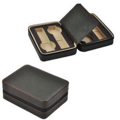 Kutija za odlaganje satova (za max 4 sata). Spoljašnost: Crna reljefna koža. Unutrašnjost: Somot u kamel boji. Dimenzije kutije: Š -17,7cm; D -13,5cm; V - 6cm.